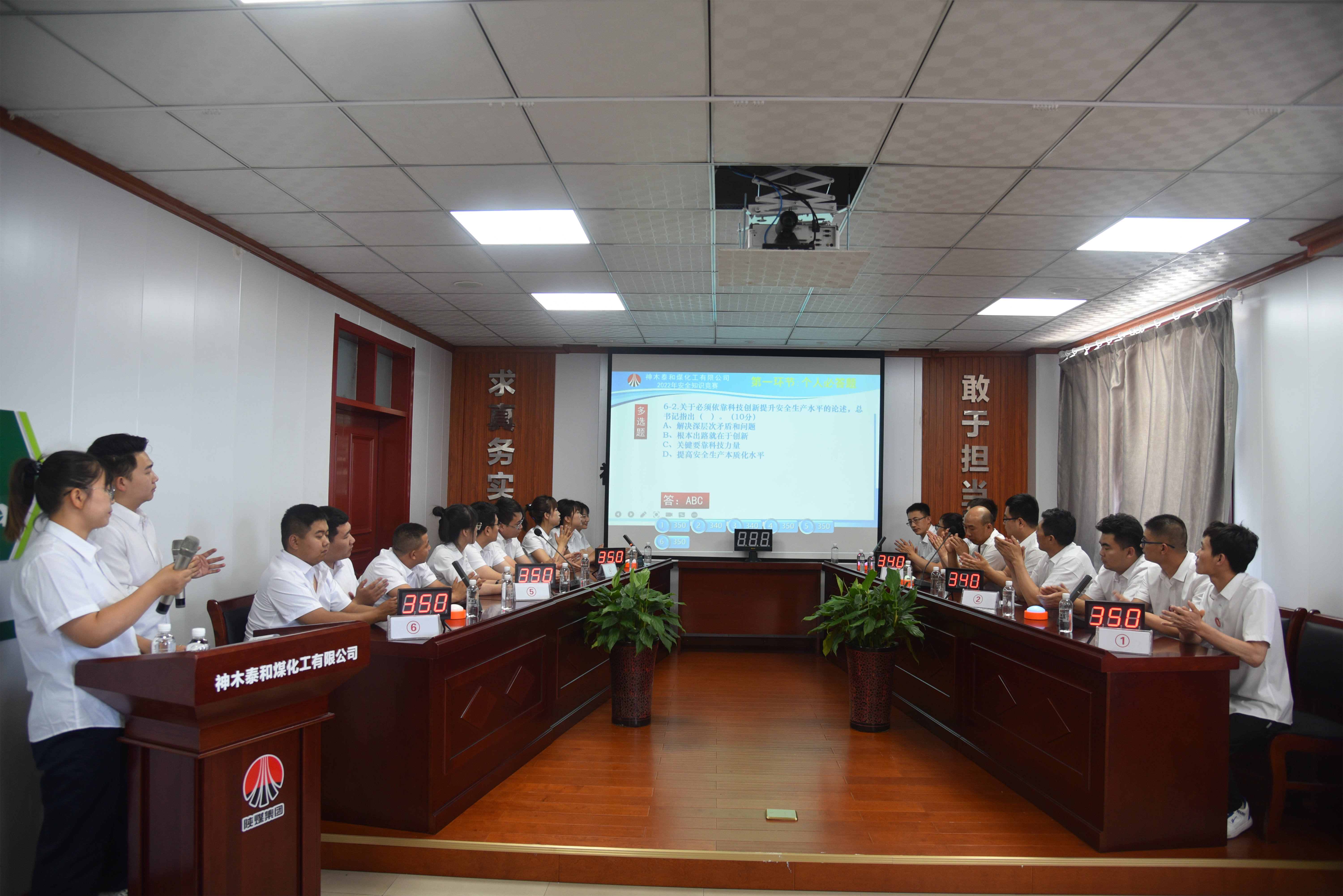 6月15日下午,神木煤化工泰和公司舉辦了“學法規、轉觀念、抓落實、強管理、迎盛會”安全生產普法知識競賽活動。神木應急管理局中隊長劉國平、神木煤化工公司安全生產環保部人員,泰和公司董事長王志忠及領導班子成員,泰和公司員工共計70余人觀看了競賽。