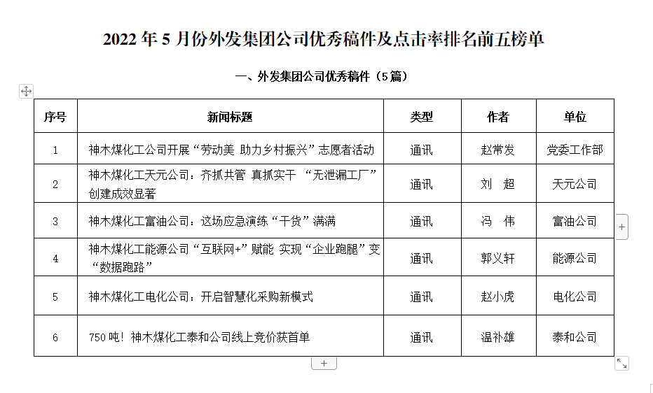 關于2022年5月份神木煤化工公司發稿及優秀稿件評選情況的通報