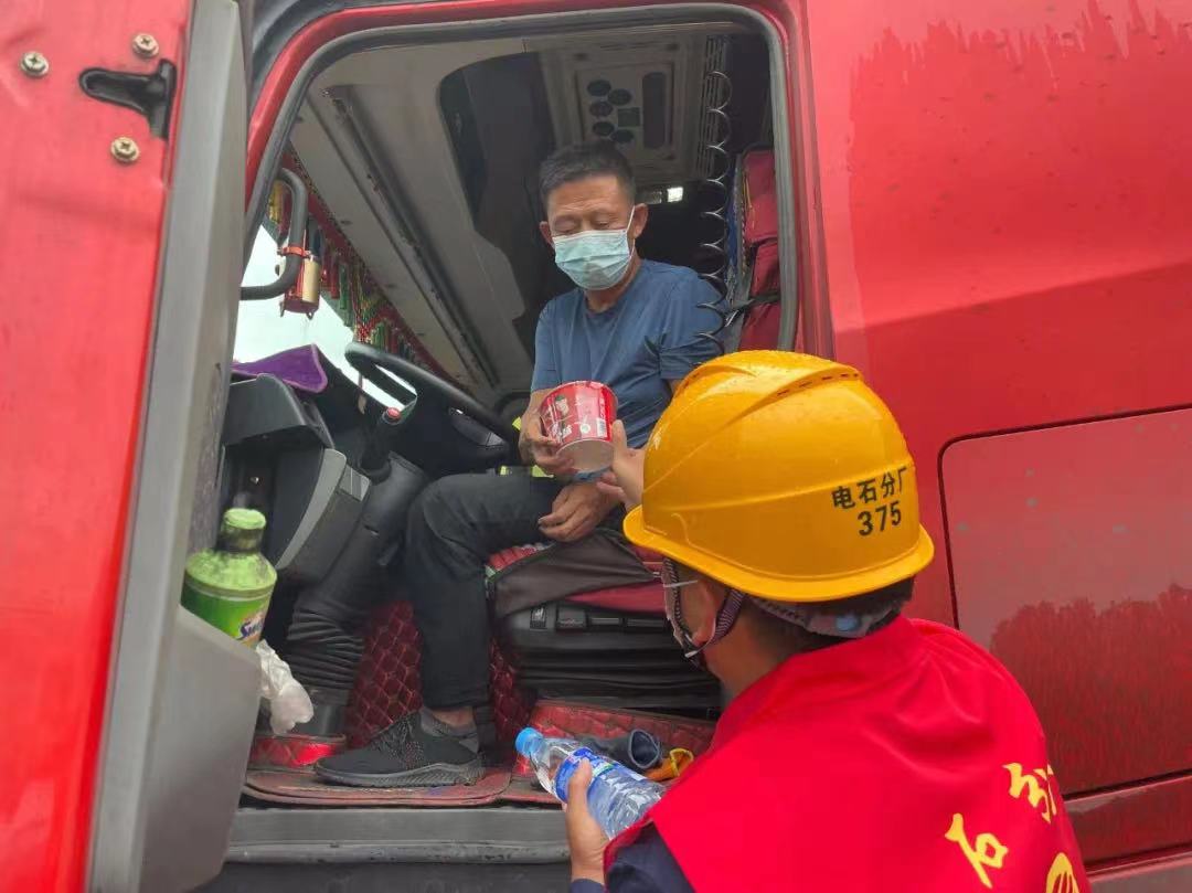 8月23日下午,神木煤化工電化公司志愿者們為輸煤通道滯留的司機師傅們送去溫暖。一杯杯熱氣騰騰的開水,一桶桶熱乎乎的泡面,一句句暖心的話語,解決了滯留司機的燃眉之急,還溫暖了他們的心。(杜仙 張茹)