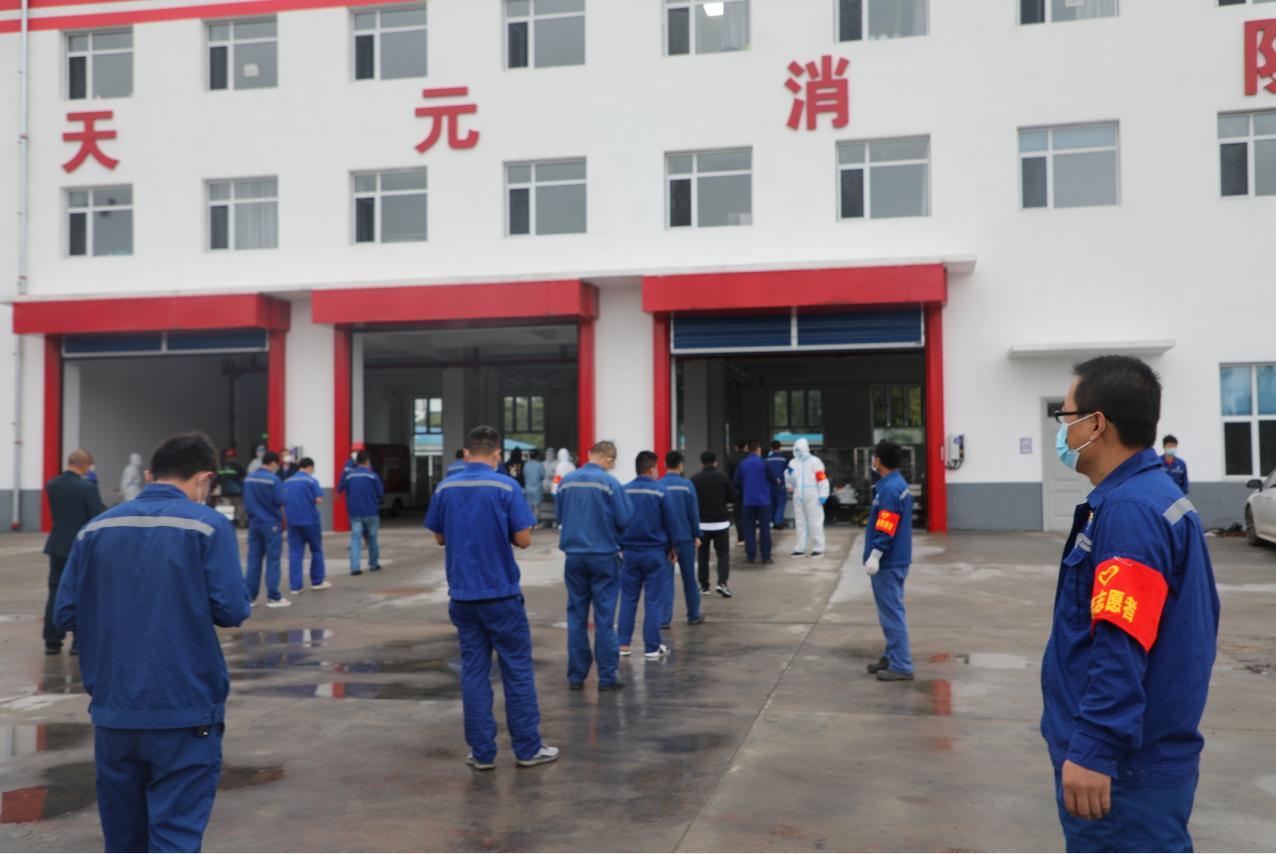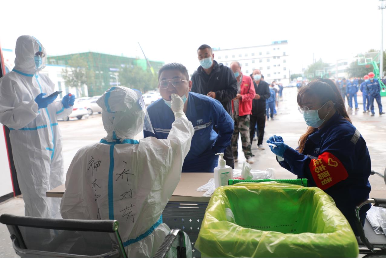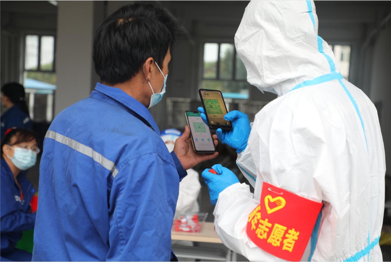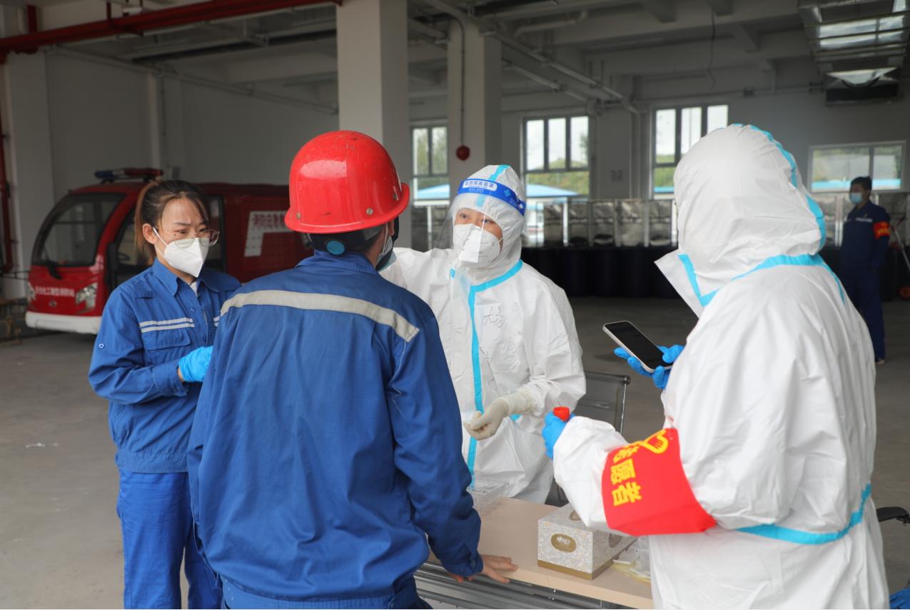 在核酸檢測現場,他們身穿防護服,肩戴紅袖章,有序進行著秩序引導、掃碼、拆拭子袋等工作,盡管一直重復著同樣的動作,但是沒有人喊累。大家堅持到最后,保證廠區2000余人完成采樣,確保核酸檢測快速、高效、有序進行。