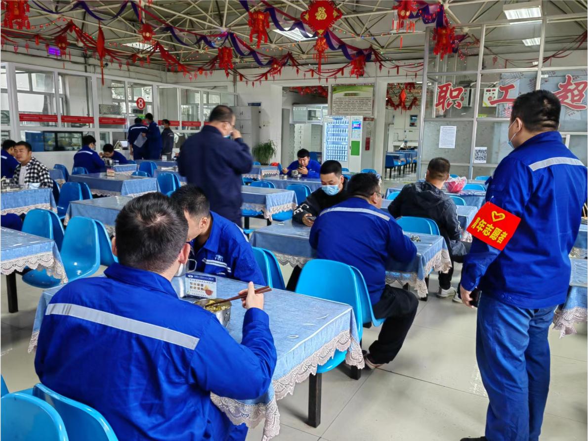 在職工食堂,每到飯點,他們提前到崗,引導所有就餐人員佩戴口罩,間隔一米線有序取餐,就餐時交叉就座等,直到最后一人取餐、所有職工按要求就座后,他們才開始取餐……