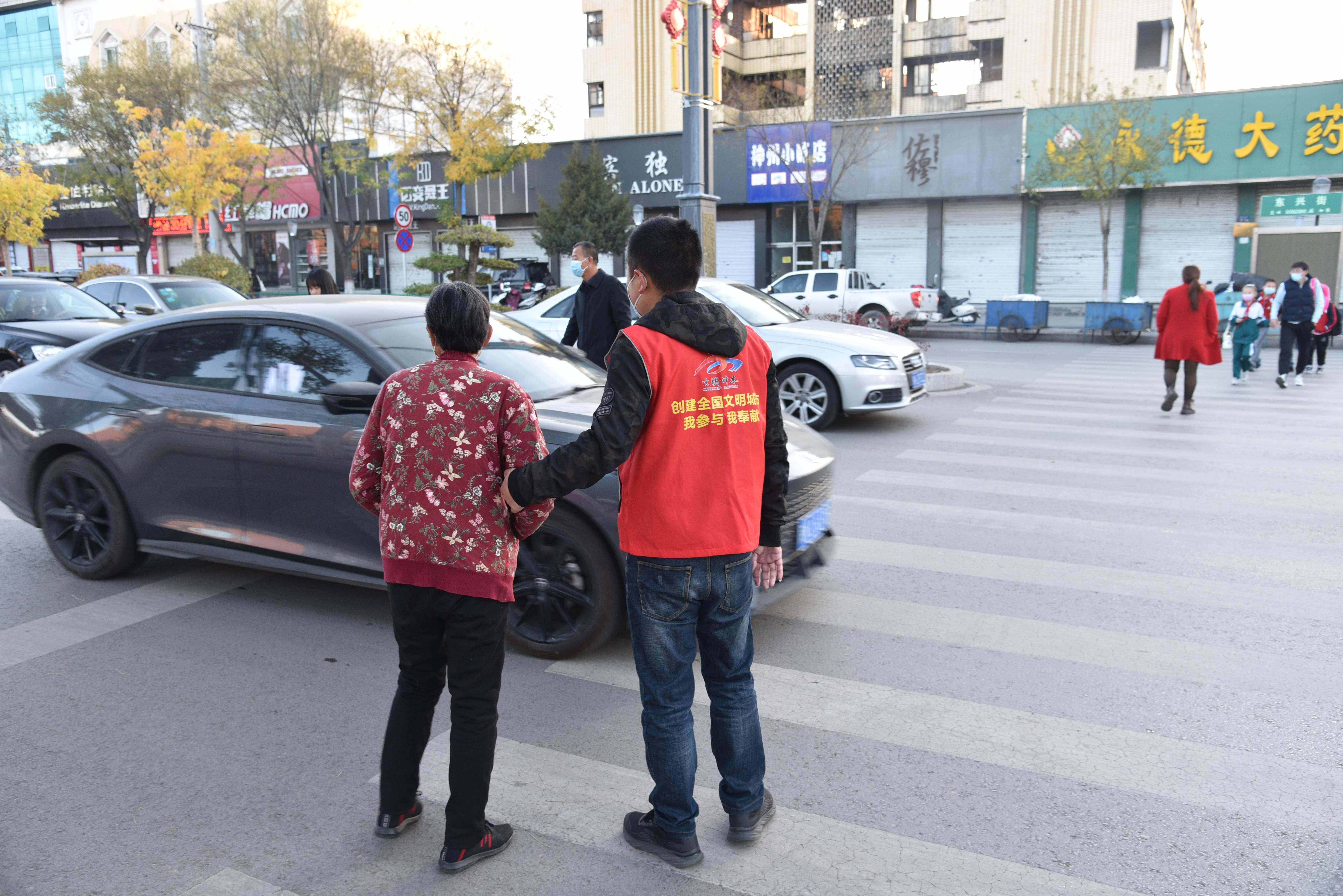 “小朋友,過斑馬線是不能跑的,你看往來的車輛這么多,很危險的,要隨時注意安全”“阿姨,您別怕,我來扶您過馬路”志愿者郭春虎護送正要上學的小朋友和老人過馬路,并給他們講解交通知識。紅色的身影成為城市文明的“活名片”,他們的笑容和善意的提醒贏得了過往行人的一致好評。