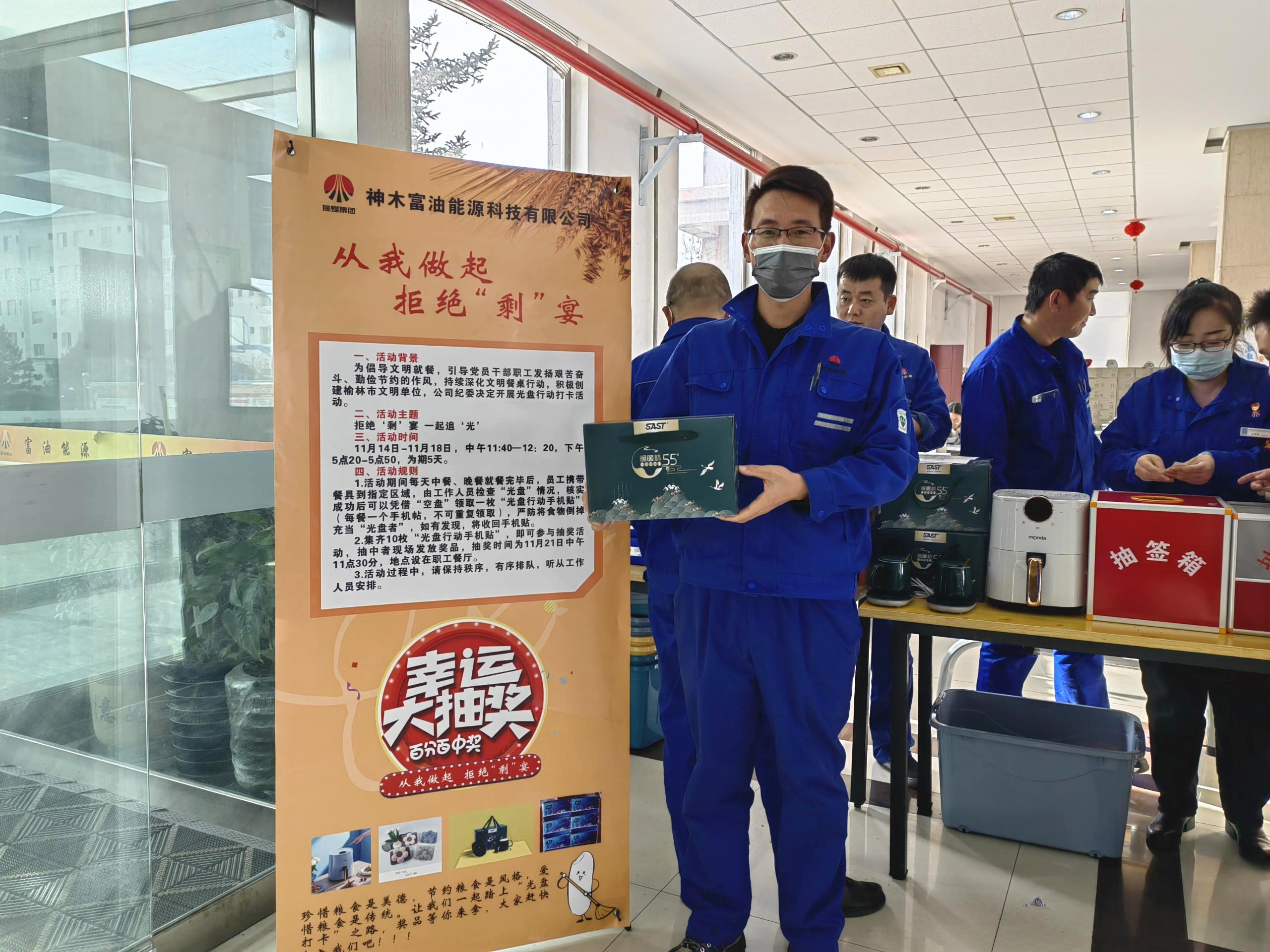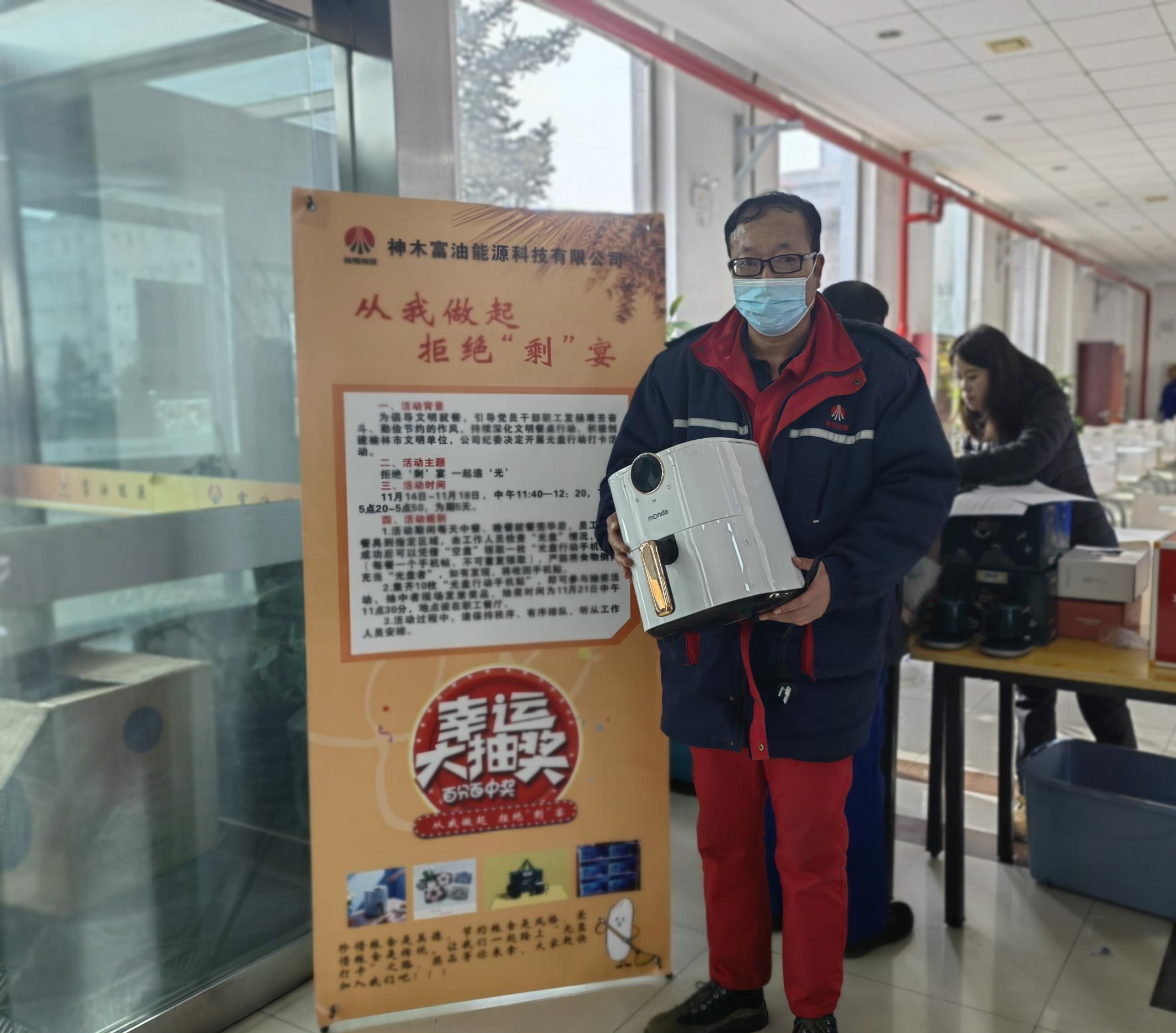 “我已經連續5天光盤,獲得了紅、橙、藍、綠、紫五種顏色卡共10張,希望能抽到大獎。”抽獎現場的一名青年員工說。“果然有大獎,今天抽到了老婆心心念的空氣炸鍋,真開心啊!在今后的工作和生活中,我將用自身的實際行動帶動我周圍的同事、還有我的家人杜絕舌尖上的浪費。”保運中心蘇永紅開心的說。