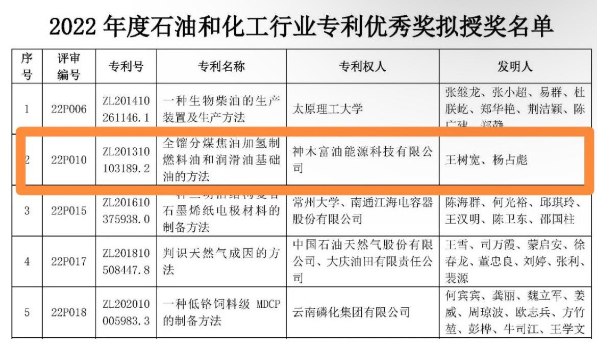 近日,中國石油和化學工業聯合會公布了2022年度石油和化工行業專利優秀獎”獲獎名單,神木富油能源科技有限公司發明的“全餾分煤焦油加氫制燃料油和潤滑油基礎油的方法”(ZL201310103189.2)榮獲專利優秀獎。