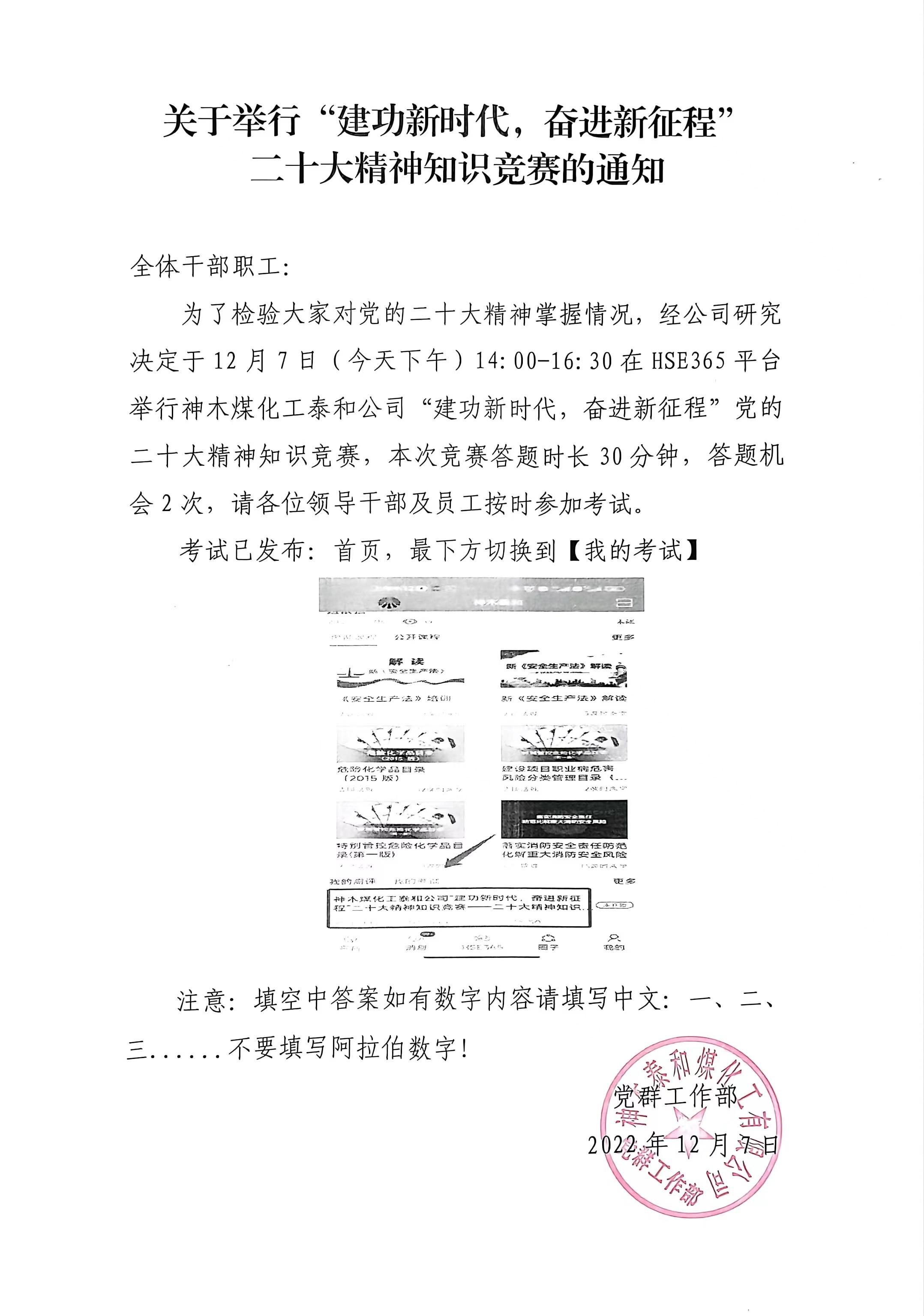 黨群工作部精心制定了本次競(jìng)賽的活動(dòng)方案,多次與HSE365平臺(tái)管理人員交流溝通,根據(jù)平臺(tái)功能和考試要求,本著有效又接地氣的命題原則,既競(jìng)出職工對(duì)黨的二十大精神的理解,又不能帶給大家過(guò)大壓力。通過(guò)微信群提前通知各部門、車間負(fù)責(zé)人將此次競(jìng)賽傳達(dá)至每一名職工,并對(duì)答題規(guī)則進(jìn)行了詳細(xì)的說(shuō)明。嚴(yán)格落實(shí)疫情防控要求,采取不聚集,獨(dú)自為戰(zhàn)的方式答題,降低交叉感染的風(fēng)險(xiǎn),多措并舉確保競(jìng)賽準(zhǔn)時(shí)開(kāi)展。