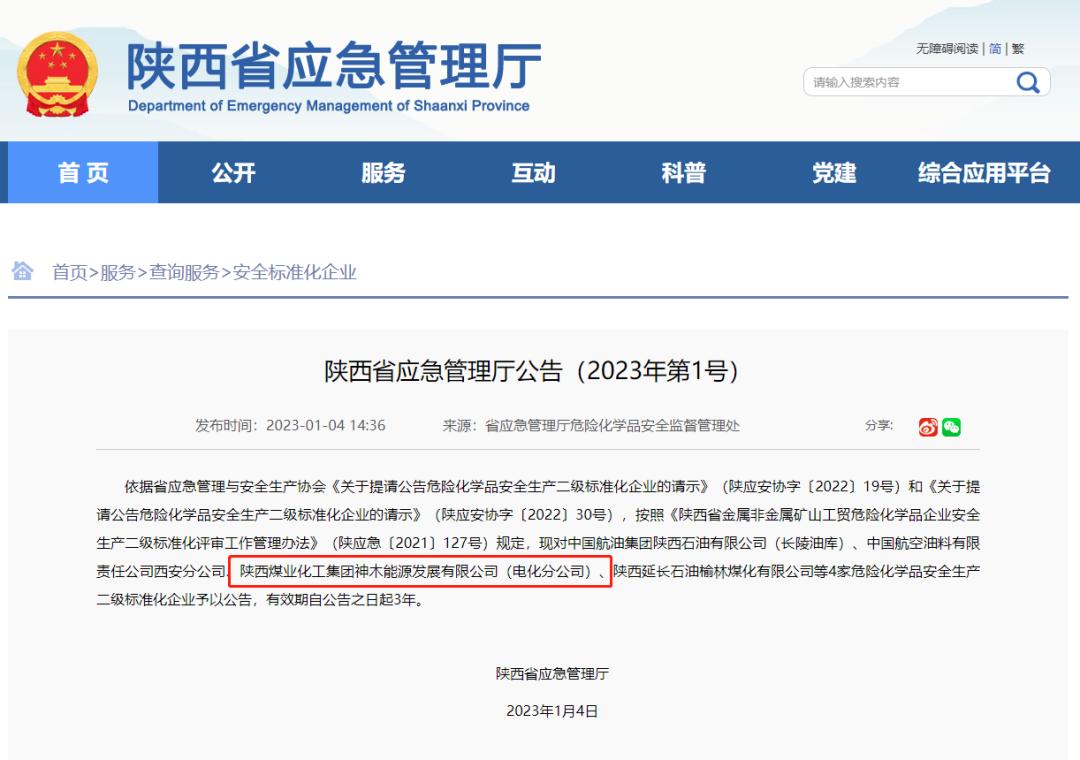近日,陜西省應急管理廳(2023年第1號)公告,神木煤化工能源公司電化分公司被核準為危險化學品安全生產二級標準化企業。