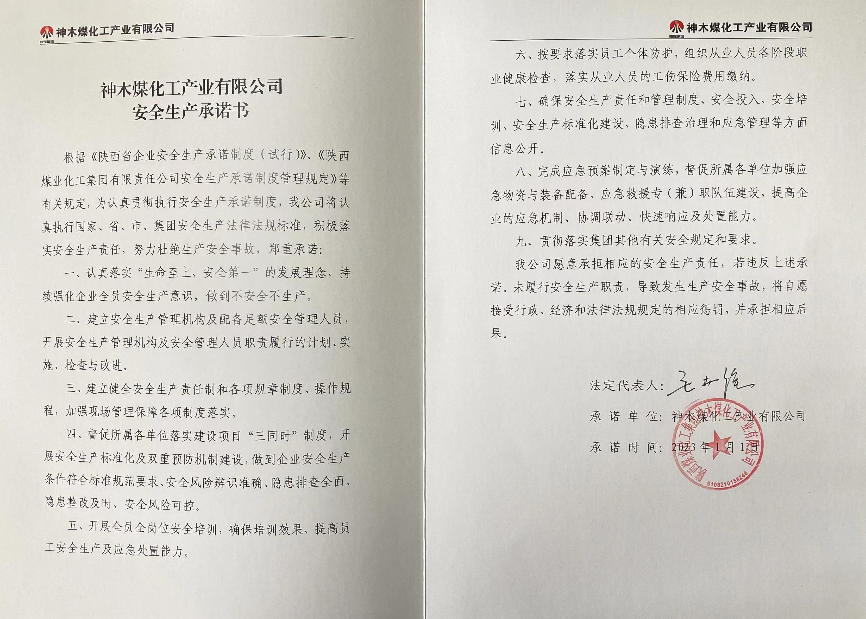 神木煤化工產業有限公司2023年度安全生產承諾書公示