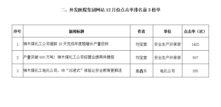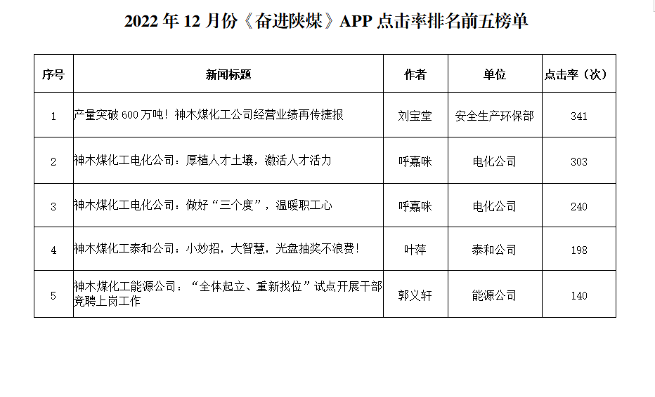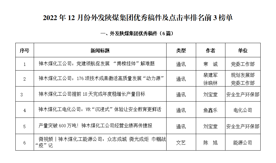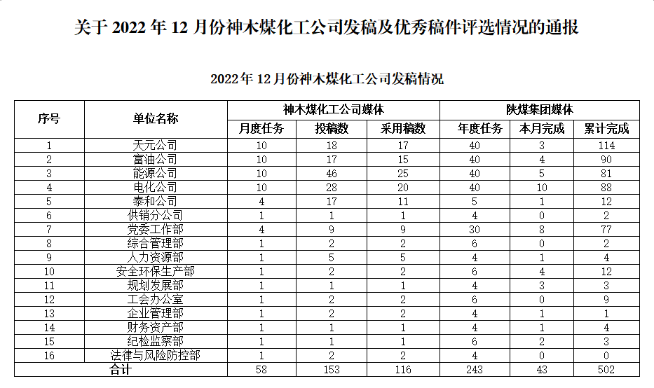 關(guān)于2022年12月份神木煤化工公司發(fā)稿及優(yōu)秀稿件評選情況的通報