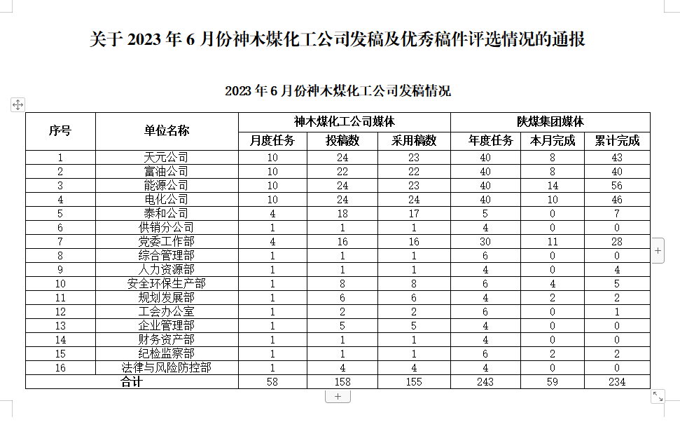 關(guān)于2023年6月份神木煤化工公司發(fā)稿及優(yōu)秀稿件評(píng)選情況的通報(bào)