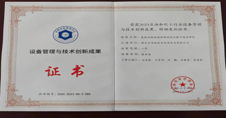 近日,神木煤化工能源公司氨肥法脫硫塔濃縮段優化提升技術研究項目榮獲中國設備管理協會“設備管理與技術創新成果”二等獎。