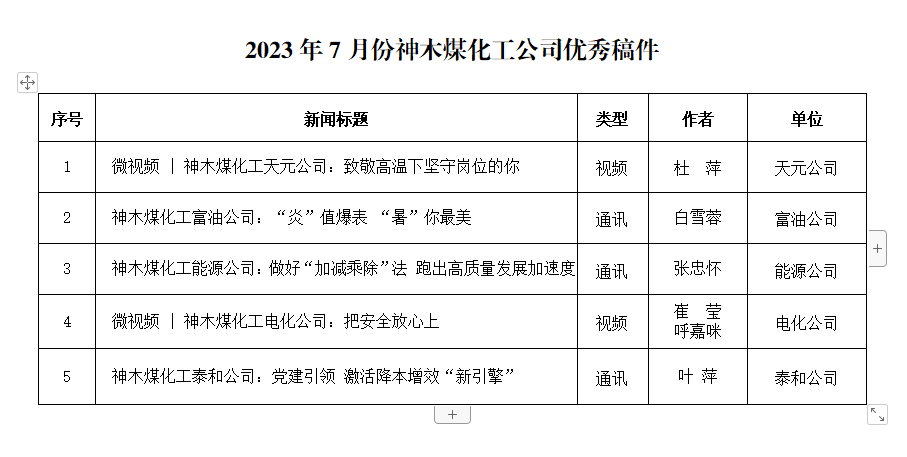 關(guān)于2023年7月份神木煤化工公司發(fā)稿及優(yōu)秀稿件評選情況的通報