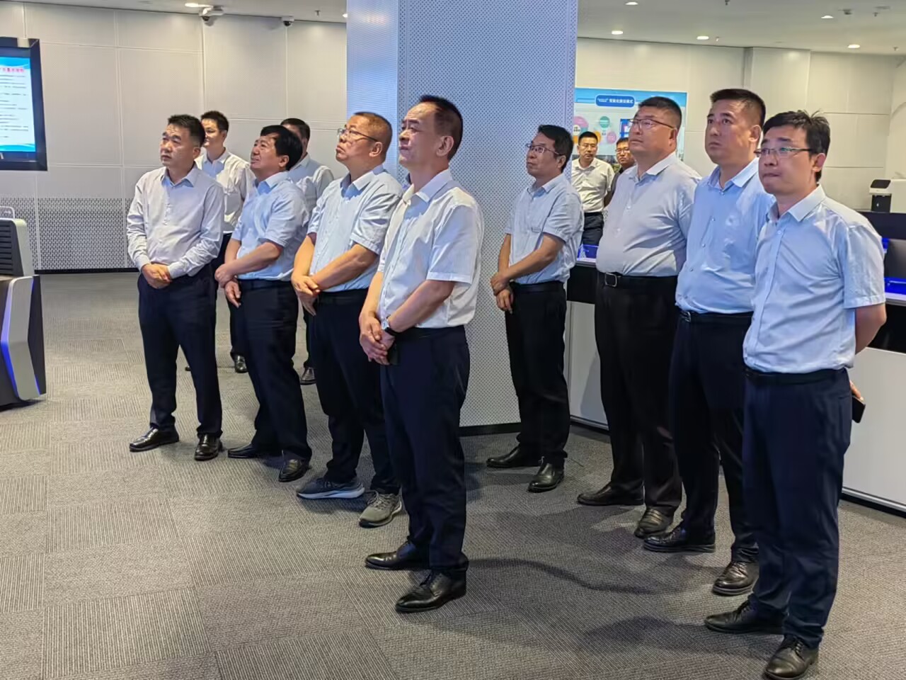 雷宏春一行先后參觀了檸條塔礦業公司智慧大樓、企業文化展廳和礦山生態修復實地情況。在智慧大樓和企業文化展廳,參觀人員不時在中控大廳、企業宣傳展板前駐足停留,圍繞工業智能化、綠色工廠建設和企業創新發展等經驗、做法進行深入交流、探討。