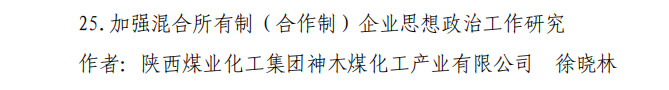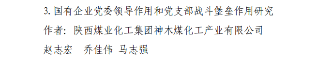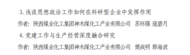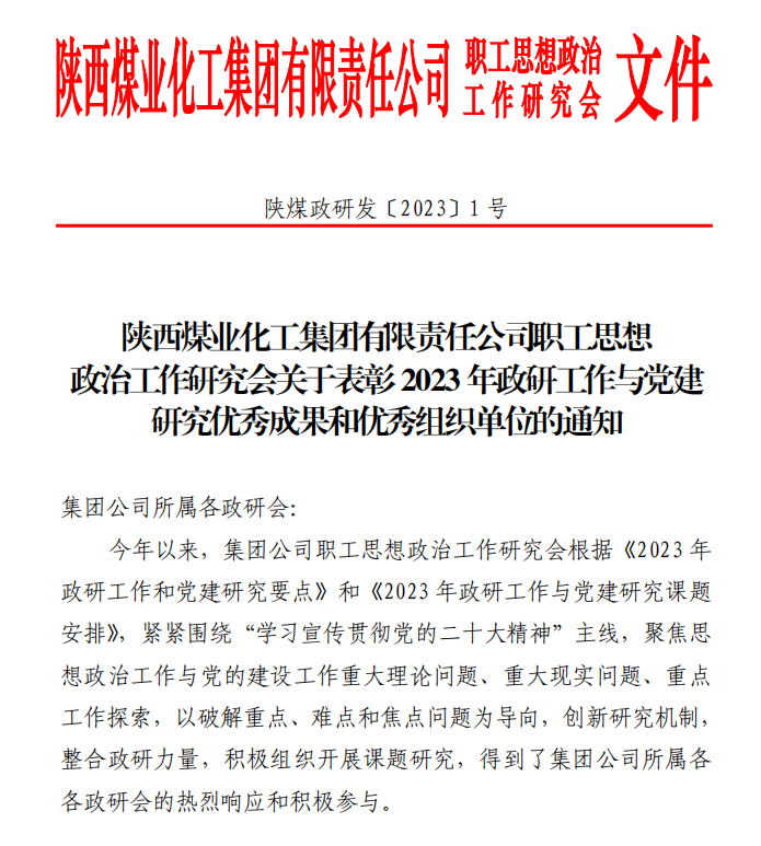 近日,陜煤集團(tuán)下發(fā)了《關(guān)于表彰2023年政研工作與黨建研究優(yōu)秀成果和優(yōu)秀組織單位的通知》,公布了2023年政研工作與黨建研究優(yōu)秀成果及優(yōu)秀組織單位名單,神木煤化工公司榮獲三個(gè)三等獎(jiǎng)和五個(gè)優(yōu)秀獎(jiǎng)。
