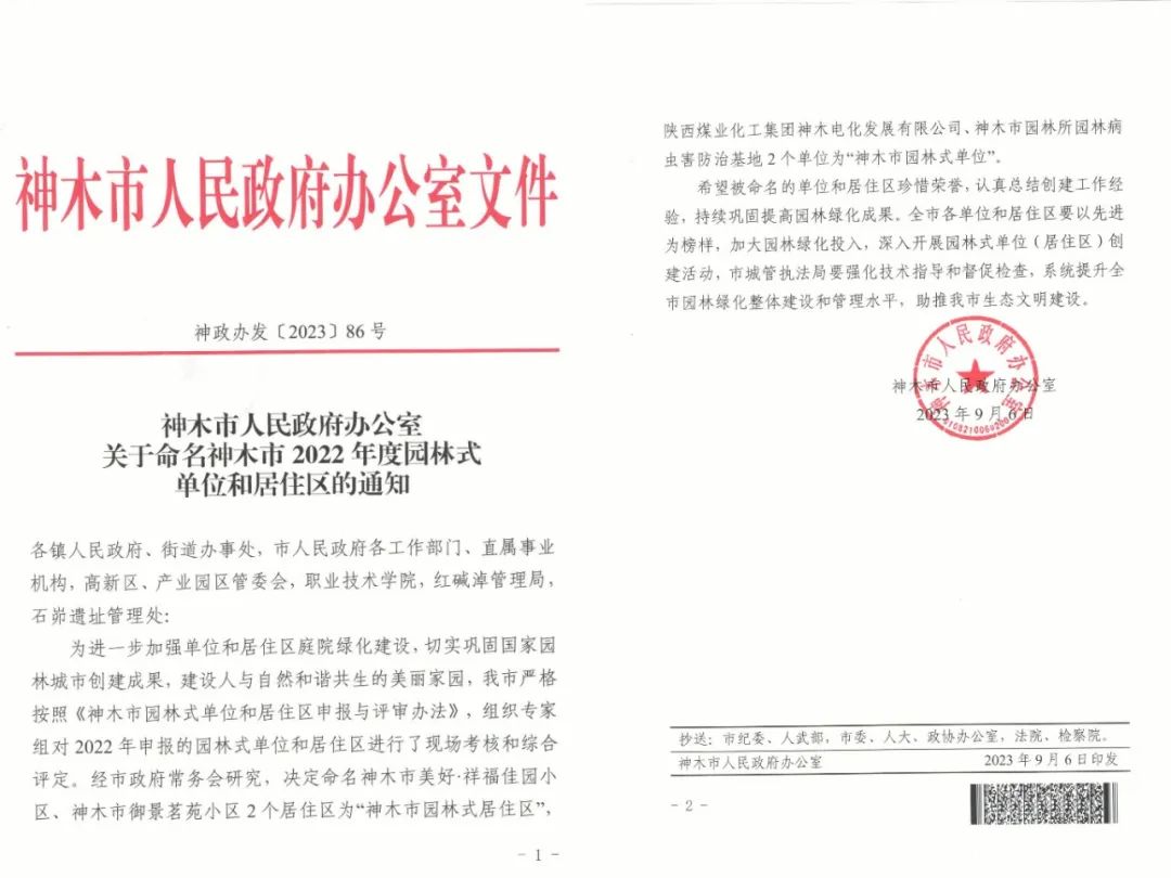 近日,在神木市人民政府公布《關(guān)于命名神木市2022年度園林式單位和居住區(qū)的通知》(神政發(fā){2023}86號(hào))中,神木煤化工電化公司被授予“2022年度神木市園林式單位”榮譽(yù)稱號(hào)。