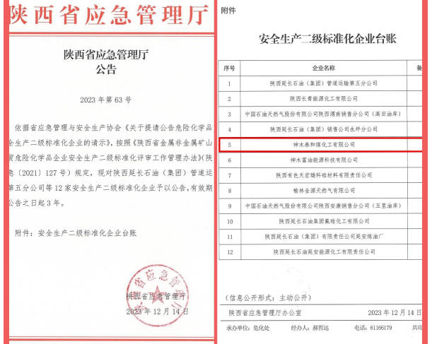 近日,從陜西省應(yīng)急管理廳公告獲悉,神木泰和煤化工有限公司順利通過安全生產(chǎn)標(biāo)準(zhǔn)化二級認(rèn)證,成為陜西省應(yīng)急管理廳公告的“首家神木市蘭炭行業(yè)安全生產(chǎn)二級標(biāo)準(zhǔn)化企業(yè)”。