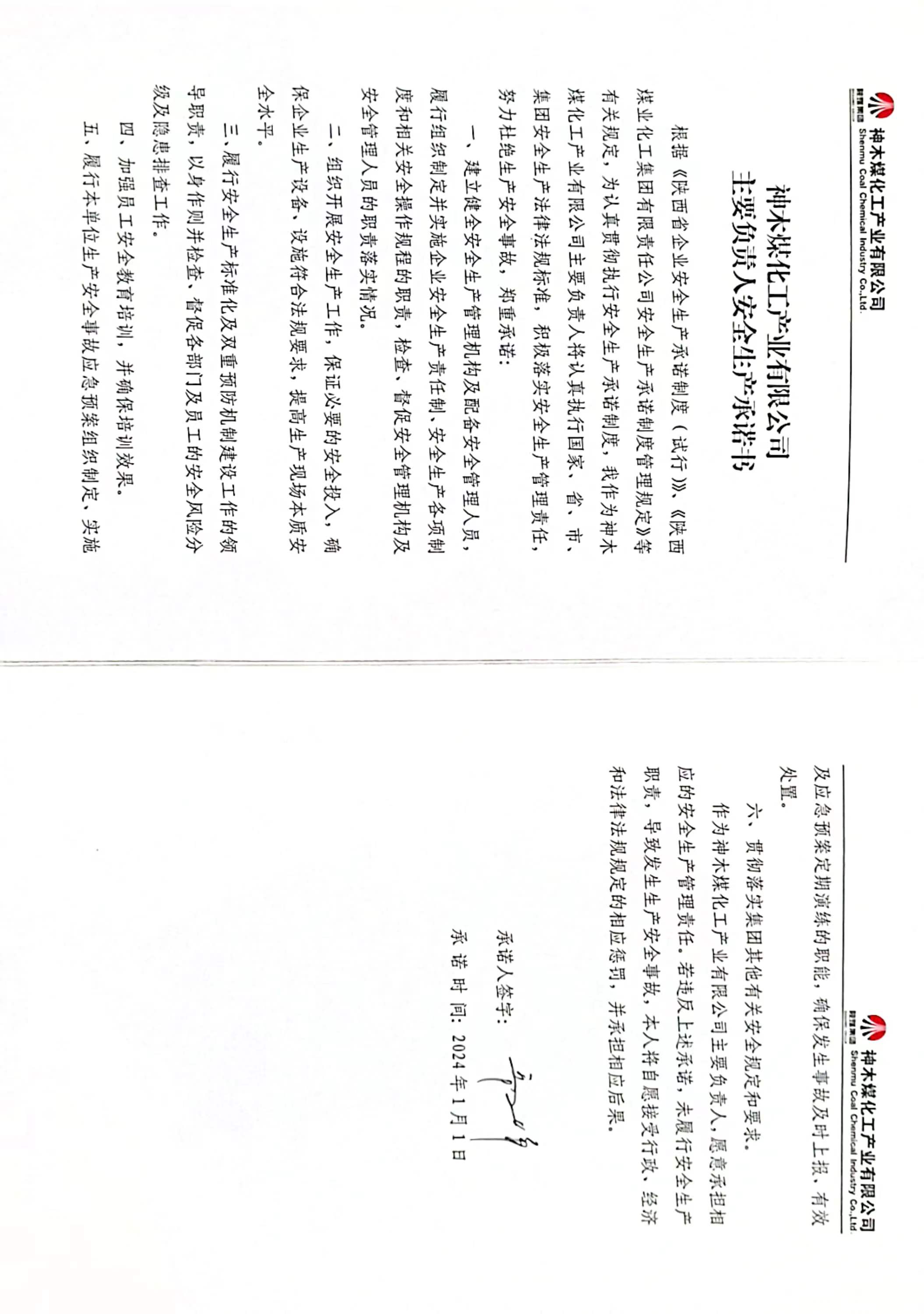 神木煤化工產業有限公司2024年度主要負責人安全生產承諾書