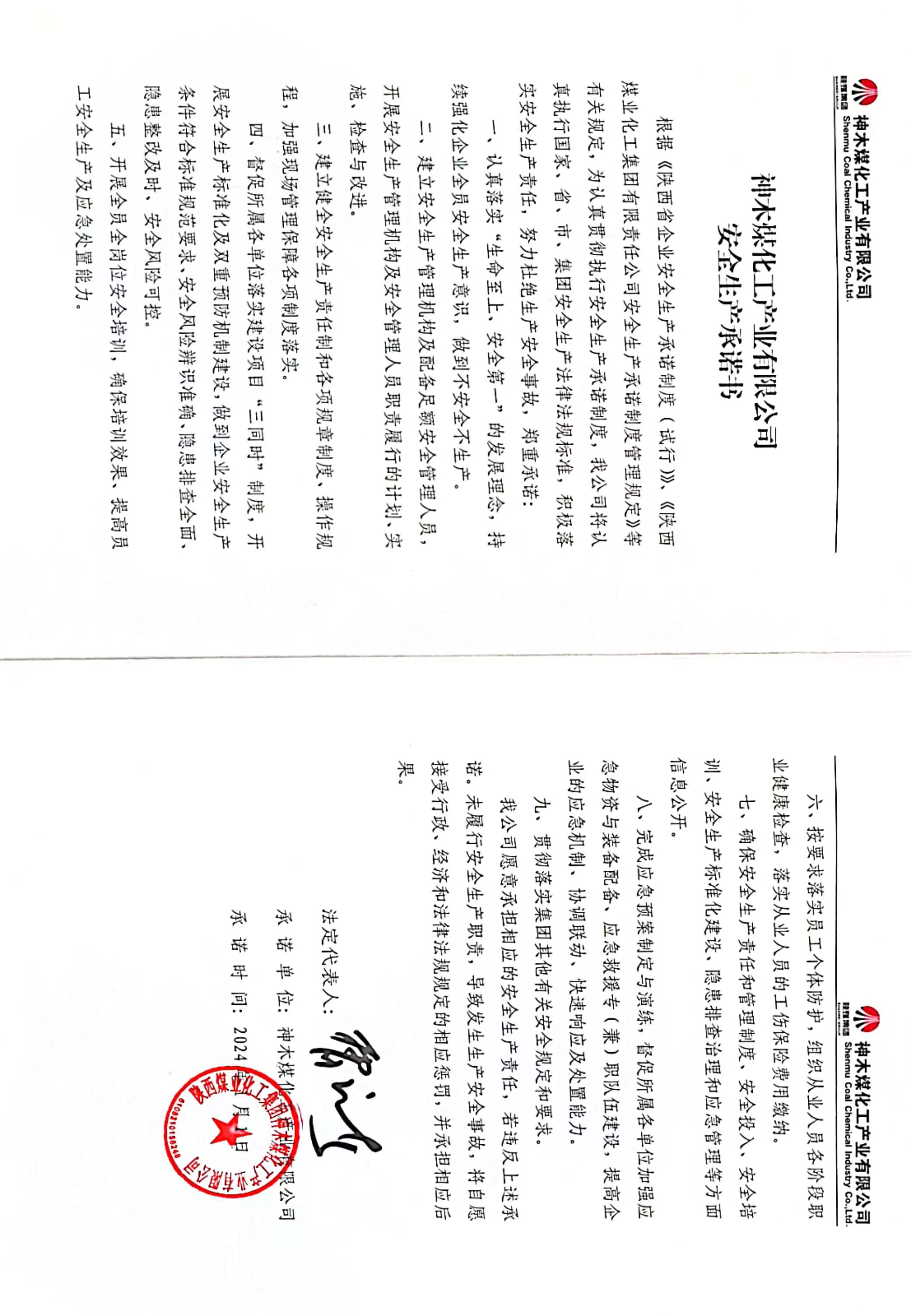 神木煤化工產業有限公司2024年度安全生產承諾書