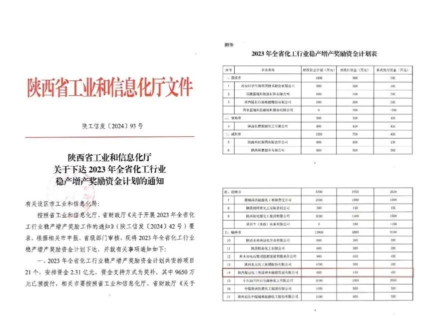 近日,從《陜西省工業和信息化廳關于下達2023年全省化工行業穩產增產獎勵資金計劃的通知》獲悉,神木煤化工能源公司獲陜西省2023年化工行業穩產增產獎勵資金450萬元。