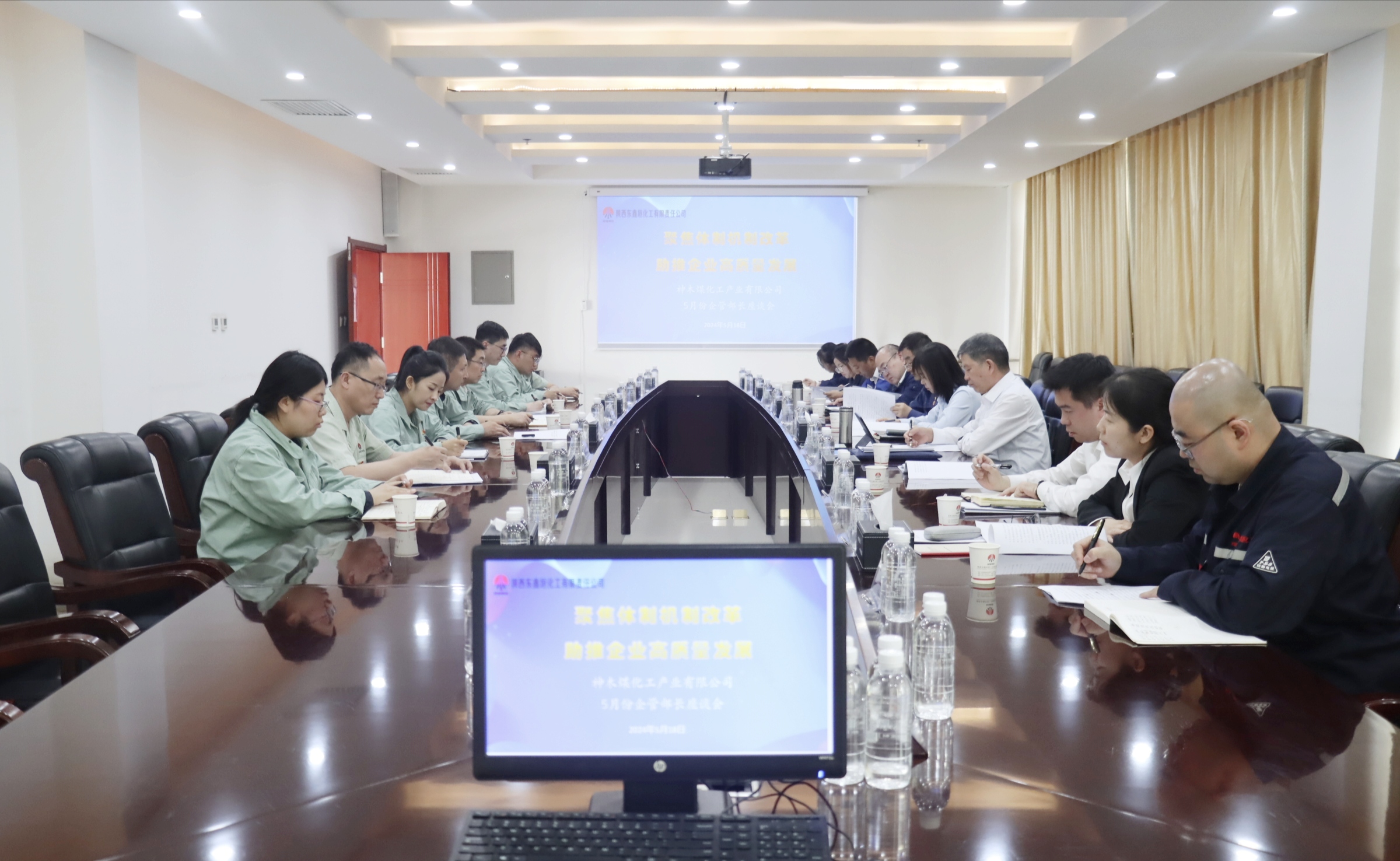 5月18日,神木煤化工公司黨委書記、董事長雷宏春,副總經(jīng)理問緒忠、張泉國及所屬各單位、機(jī)關(guān)各部門一行80余人到東鑫垣公司,就企業(yè)管理、改革創(chuàng)效、黨建工作等進(jìn)行對標(biāo)交流。