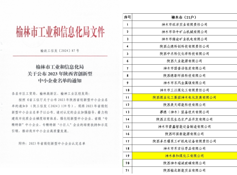 近日,從榆林市工業(yè)和信息化局《關(guān)于公布2023年陜西省創(chuàng)新型中小企業(yè)名單的通知》獲悉,神木煤化工公司所屬電化公司、泰和公司獲“2023年陜西省創(chuàng)新型中小企業(yè)”稱號。