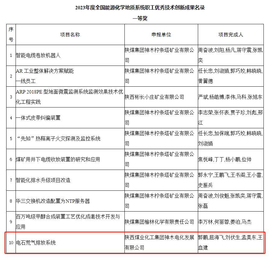 近日,從中國能源化學地質工會傳來喜訊,神木煤化工電化公司申報的“電石荒氣排放系統”項目榮獲一等獎。
