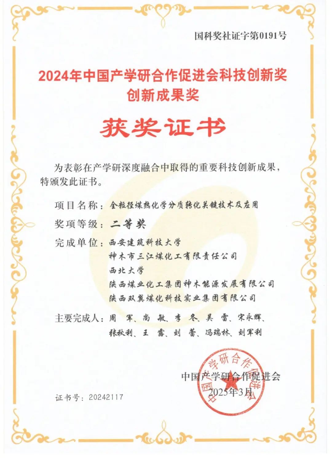 神木煤化工能源公司榮獲2024年中國產學研合作促進會科技創新二等獎