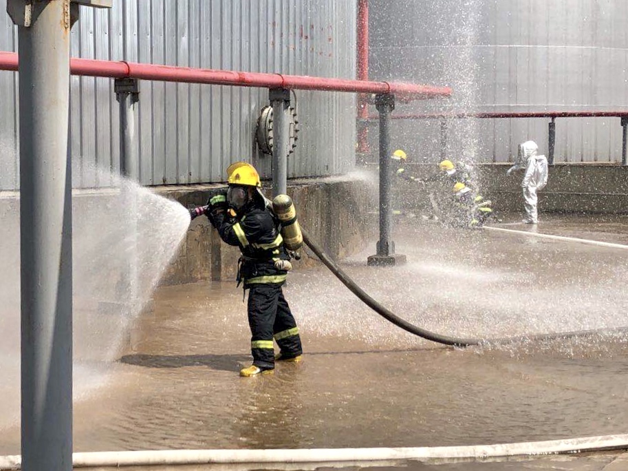 演練模擬6月12日上午10點,該公司制油分廠罐區兩名巡檢工在例行日常巡檢時發現儲油罐T-54206泄漏引起著火事故,其中一名巡檢工煙氣中毒暈倒。該公司緊急啟動生產安全事故應急預案,并將火情向廟溝門人民政府及府谷縣應急管理局報告。該公司消防隊、醫療和后勤保障組、設備搶修組、安全環保組、技術組、環保監測組等專業處置組緊急出動、協同配合,對受傷人員進行有效救援處置,火情完全得到控制并逐漸消除,應急演練圓滿完成。