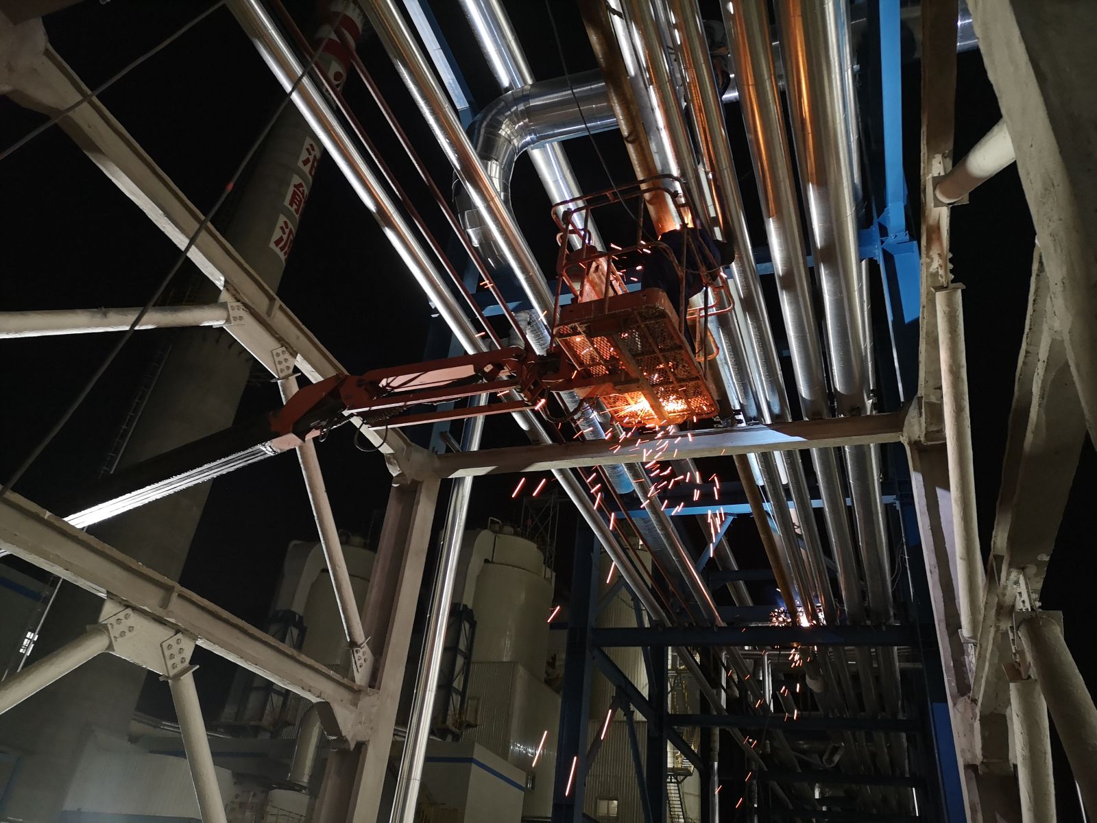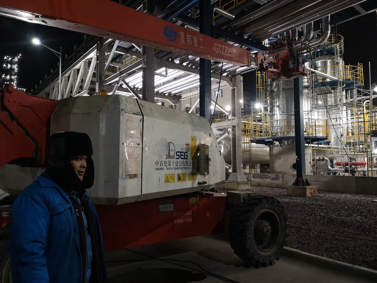 21時,施工單位司機人員在臨休假前一晚積極配合檢維修人員啟動曲臂升降機。