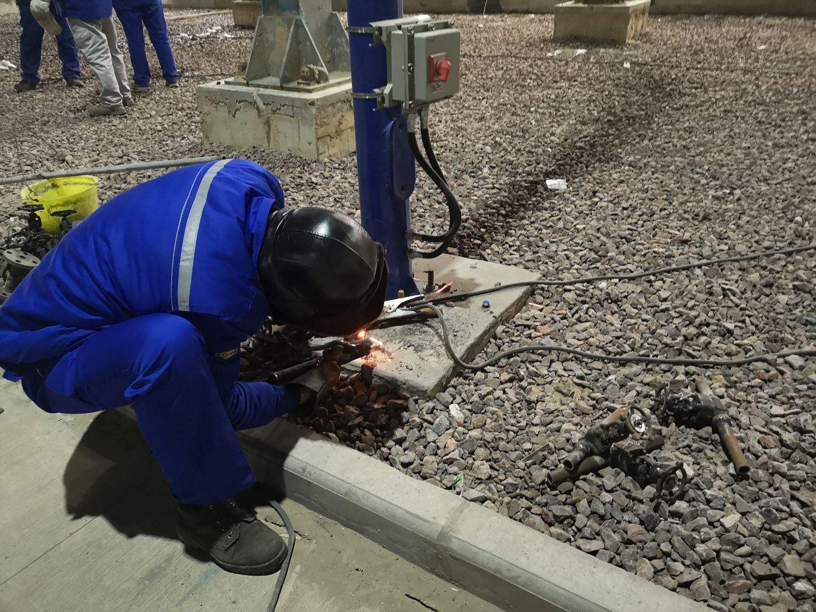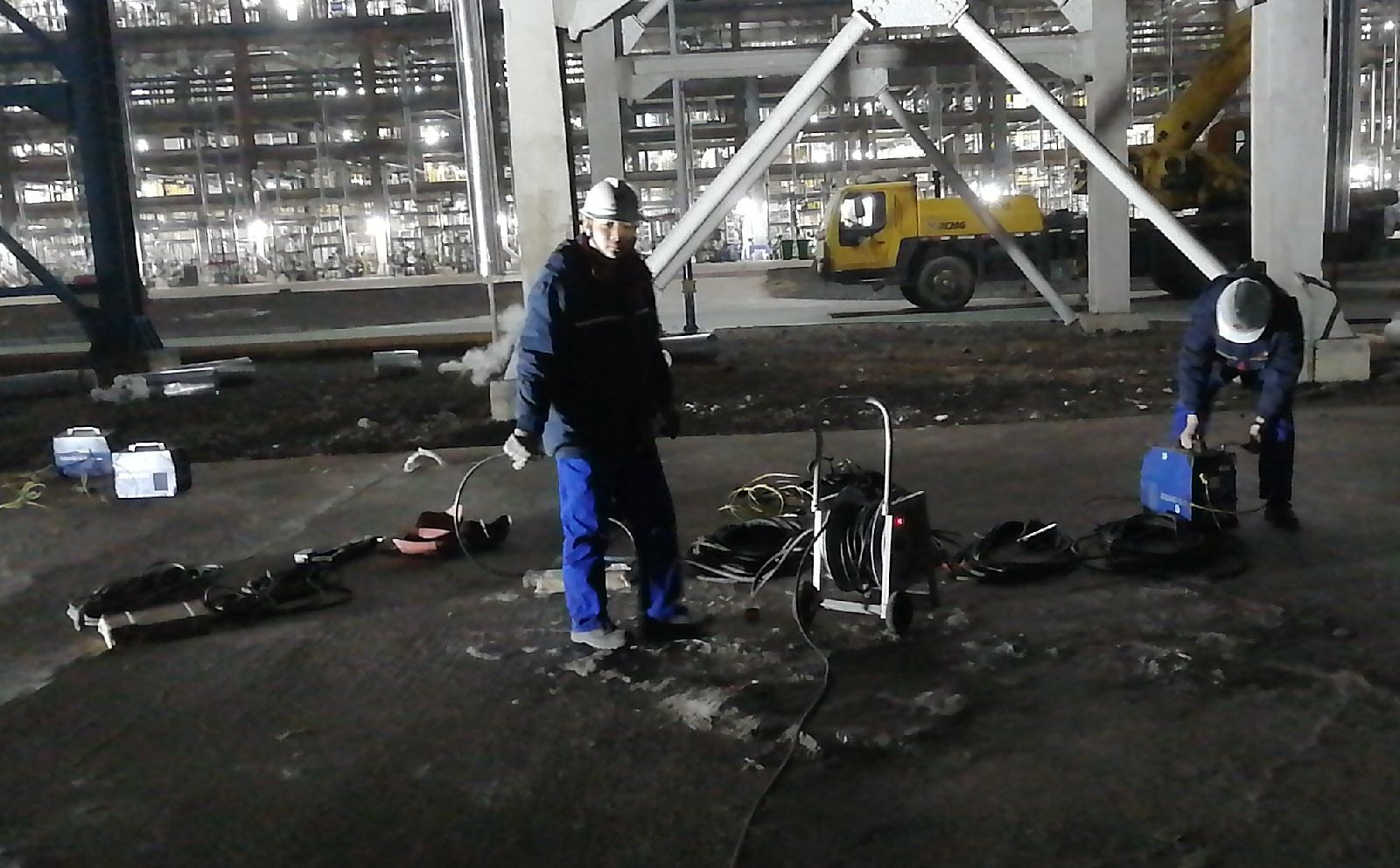 19時,保運中心電氣人員接好兩盞照明和四臺焊機。