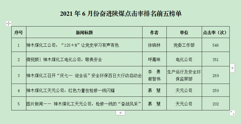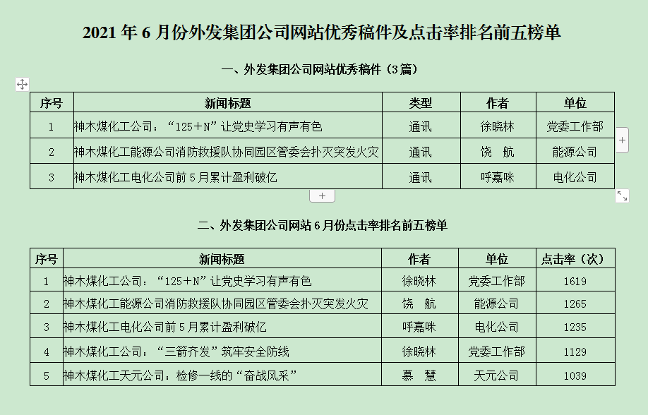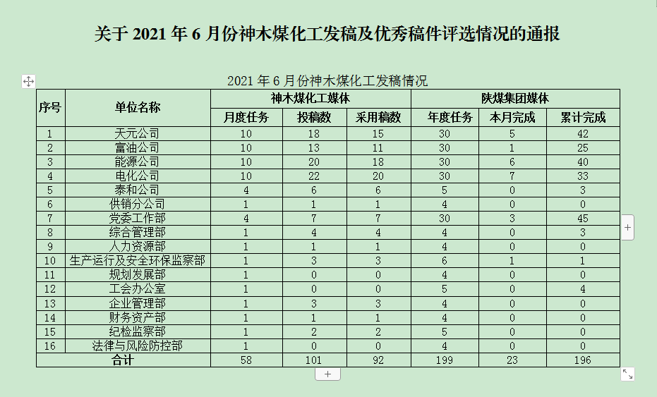 關于2021年6月份神木煤化工發稿及優秀稿件評選情況的通報