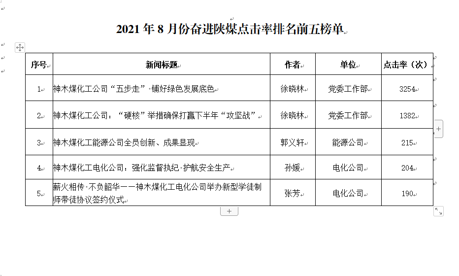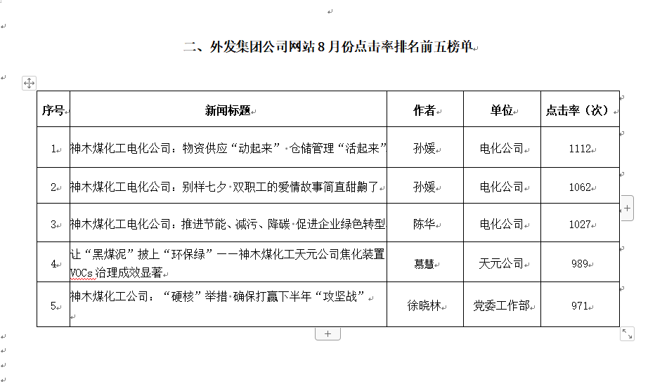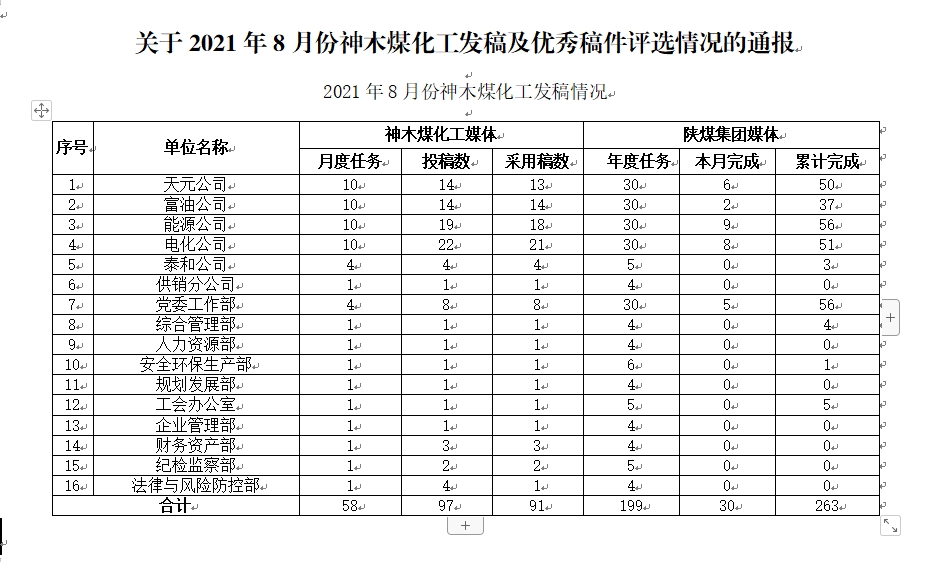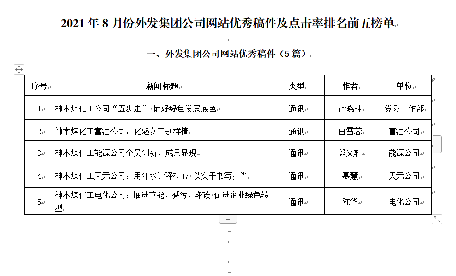 關(guān)于2021年8月份神木煤化工公司發(fā)稿及優(yōu)秀稿件評(píng)選情況的通報(bào)