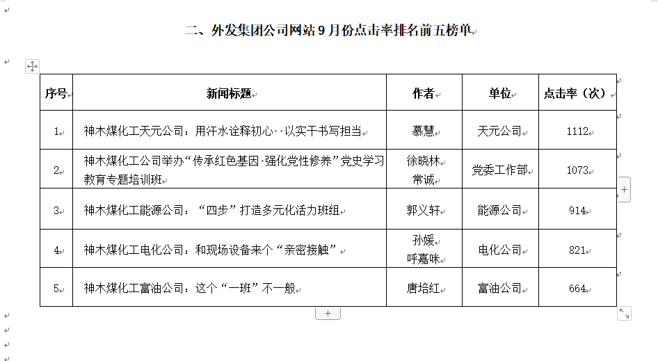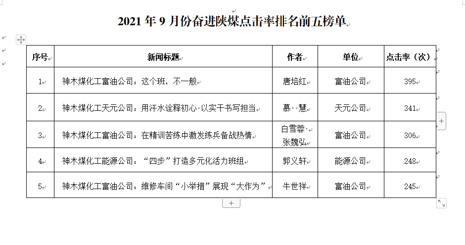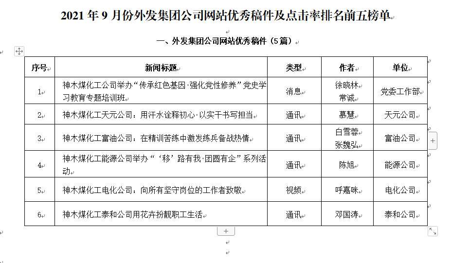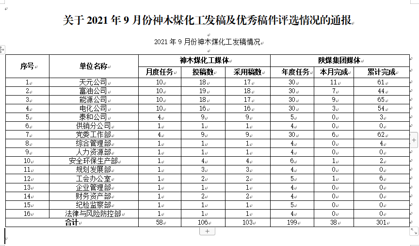 關于2021年9月份神木煤化工公司發(fā)稿及優(yōu)秀稿件評選情況的通報