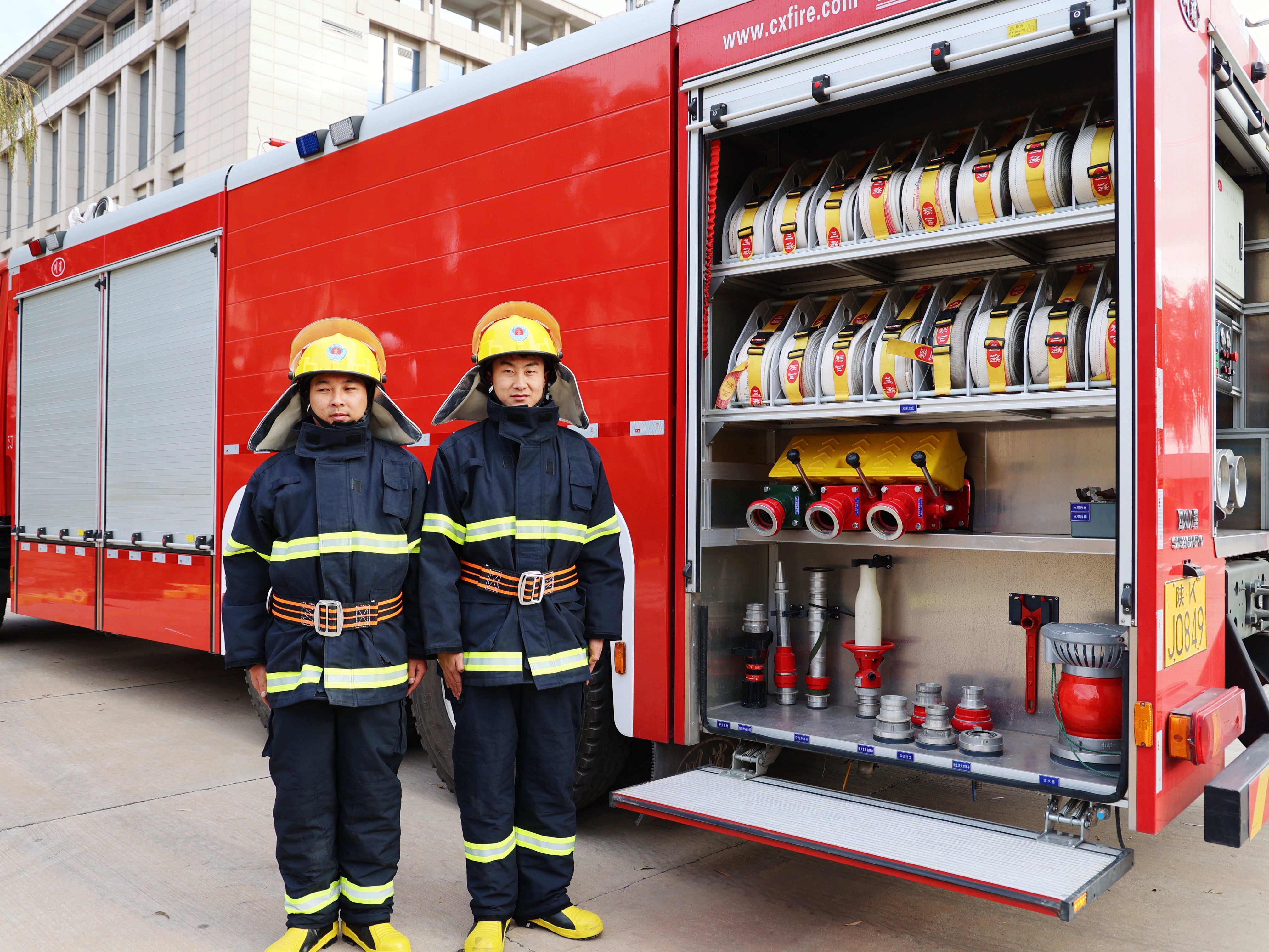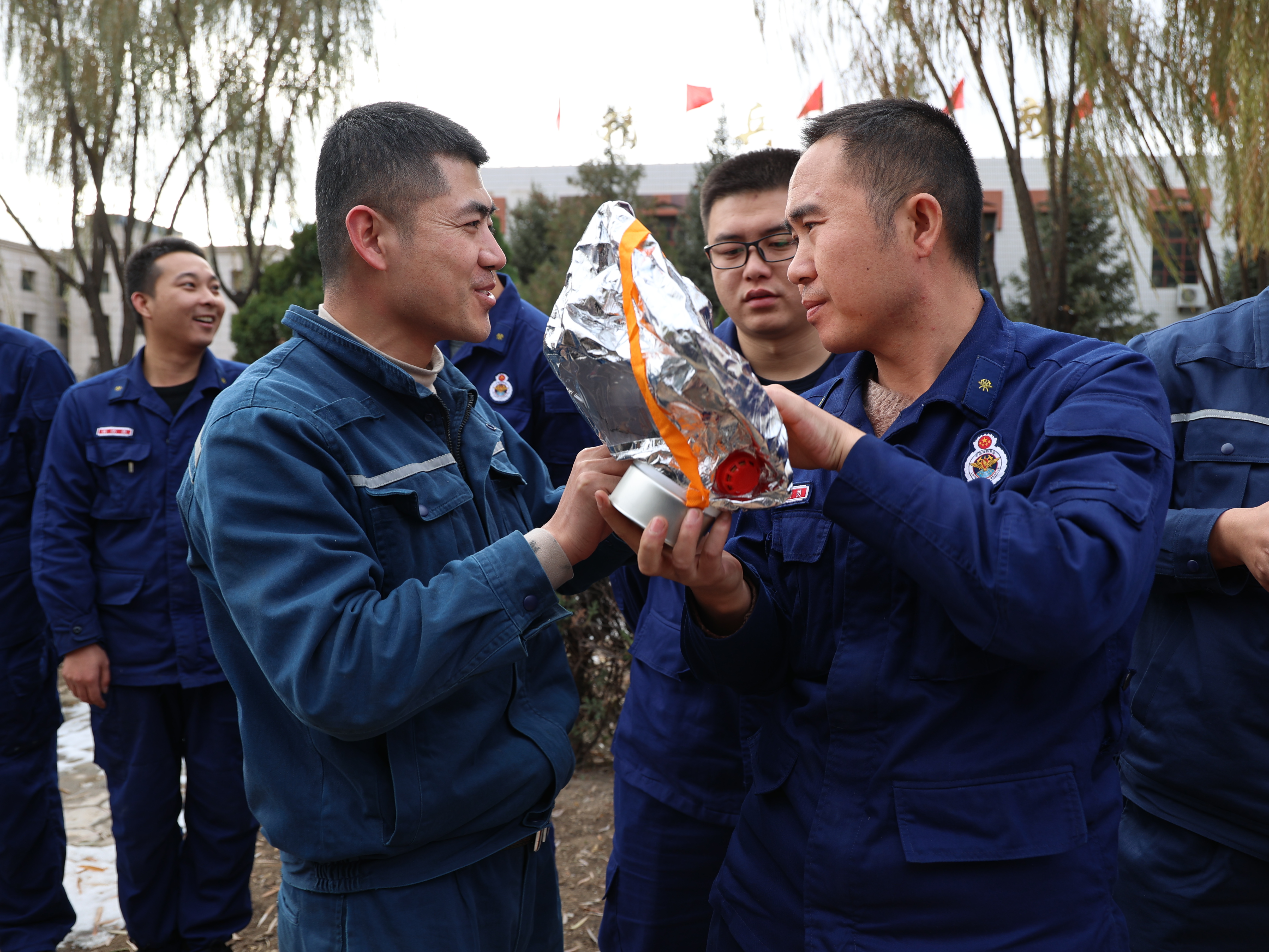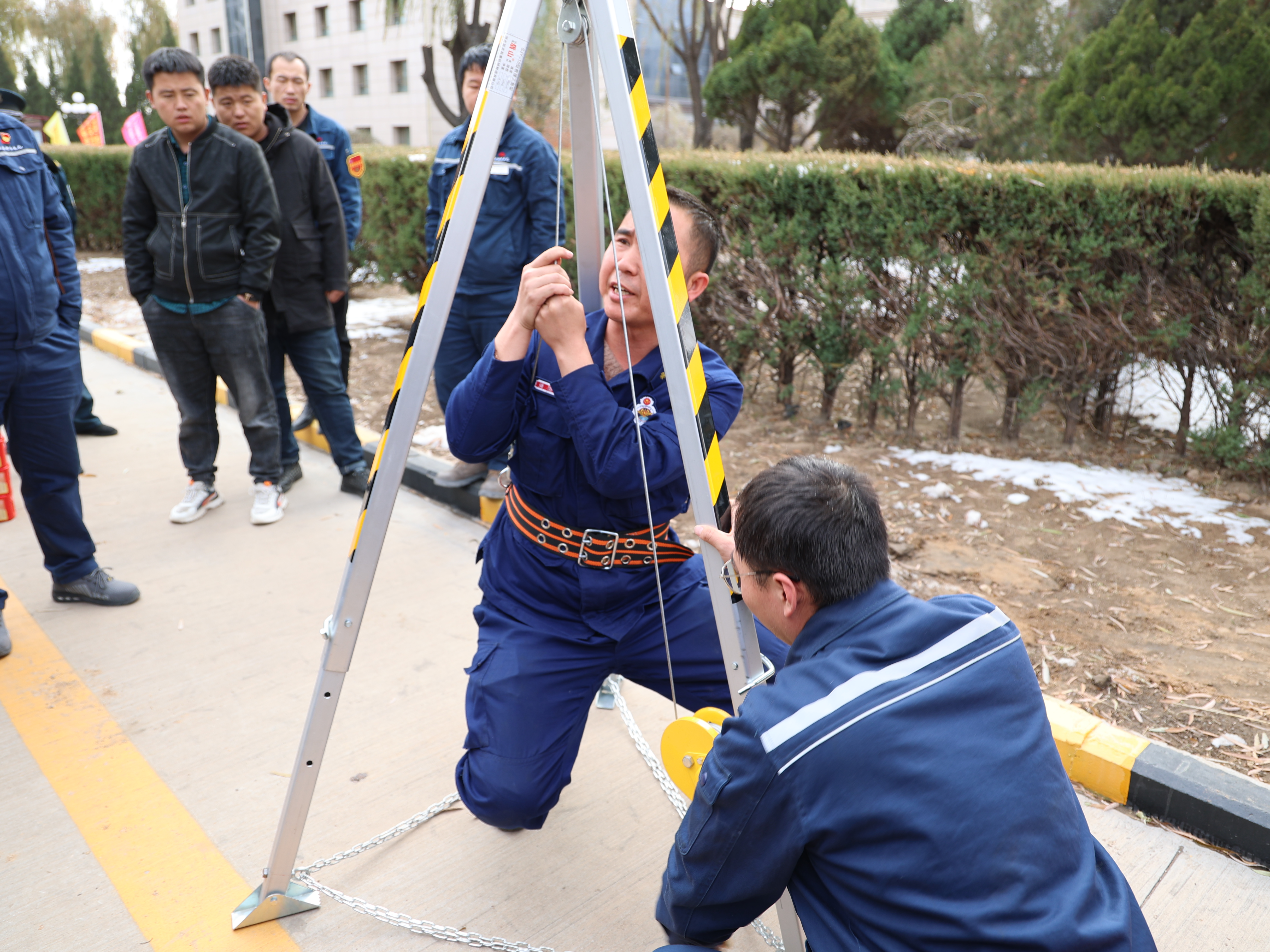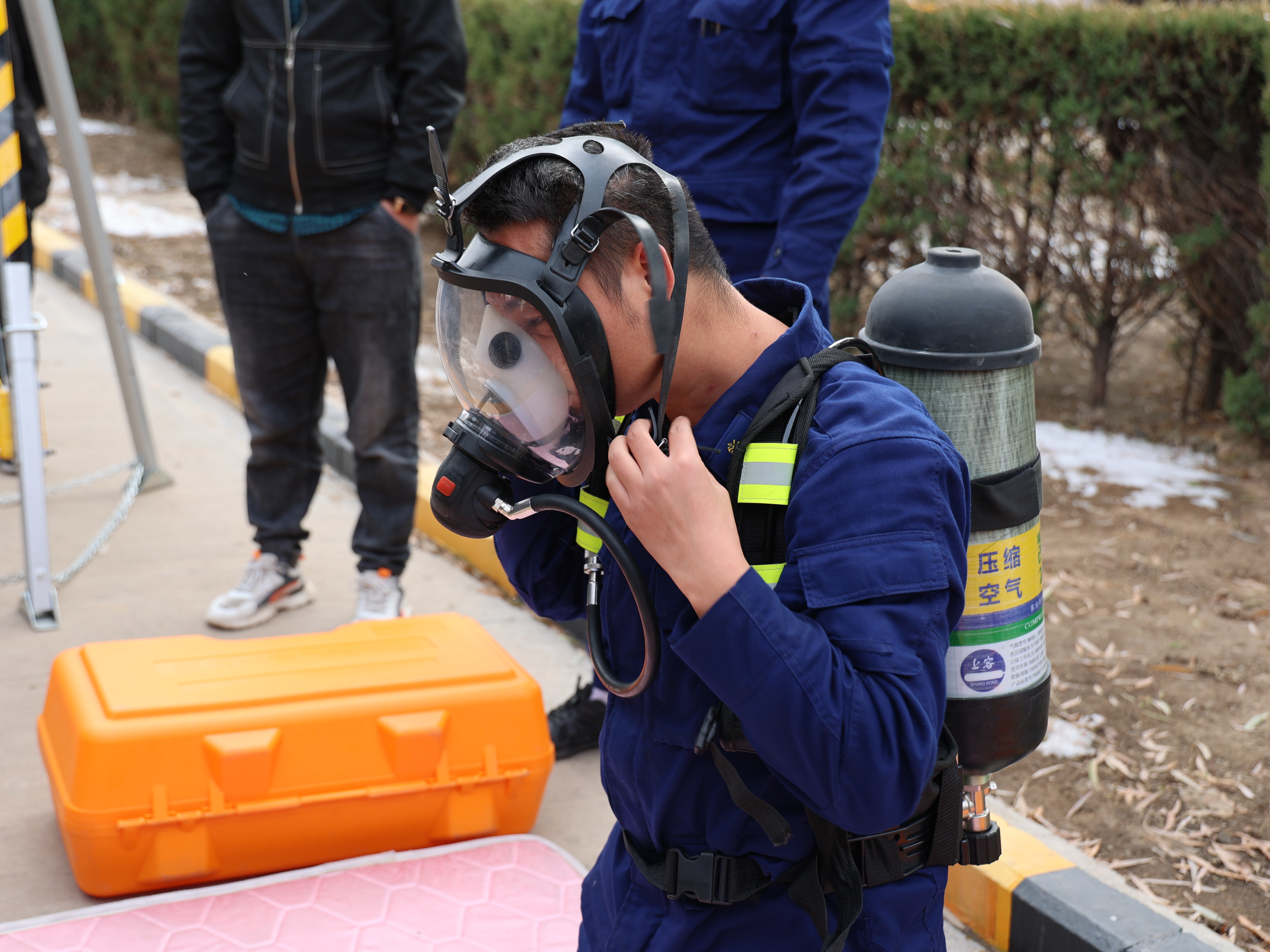在實訓演練場地,消防隊員現場演示了正壓式空氣呼吸器、移動式軸流風機、長管呼吸器、自救式逃生呼吸器、救援三腳架和各種類型滅火器的使用方法,指導員工進行了現場滅火演練,并細心指正了大家操作中的錯誤步驟。消防隊員還進行了消防服的穿戴、蹬車及水帶操作展示。