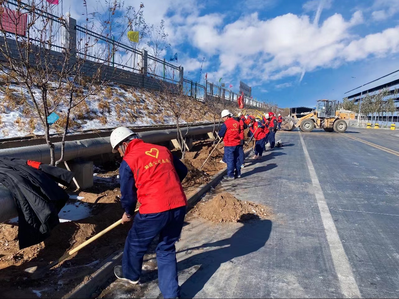 主題黨日活動中,電化黨支部宣傳委員對人員進行了簡單分工,為大家派發(fā)了衣服、手套等工具,大家身著紅色志愿服整齊有序的前往冷卻車間外綠化帶進行清理雜物、雜草、翻地。“以紅色力量助力綠化過冬,為明年的廠區(qū)綠化打好基礎。”的口號在隊伍里喊起,一時間,大家卯足了勁,在綠化帶中穿梭著,干的熱火朝天,絲毫沒有因冬天的低溫而降低勞動熱情。經過兩個多小時的共同勞動,綠化帶由原來的雜草枯葉變得干凈整潔。