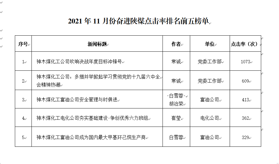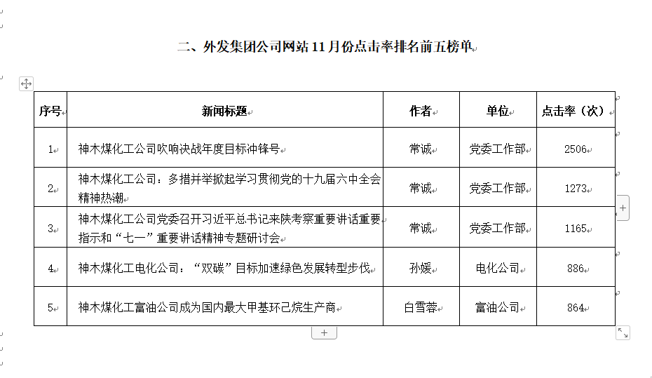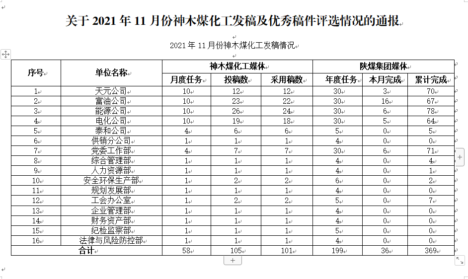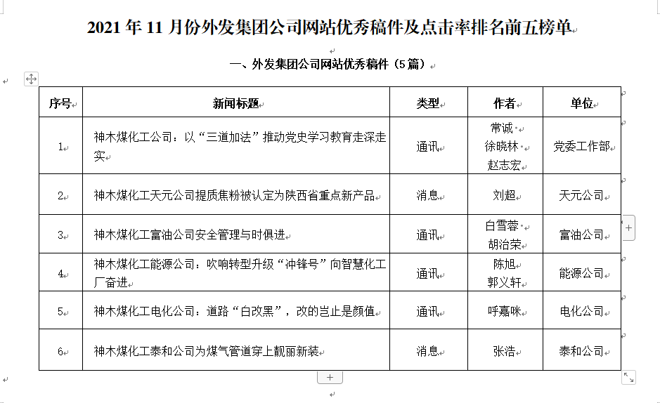 關(guān)于2021年11月份神木煤化工公司發(fā)稿及優(yōu)秀稿件評(píng)選情況的通報(bào)