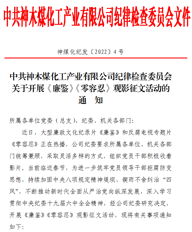 為進一步深入推進警示教育常態化、制度化,堅持標本兼治推進黨風廉政建設,持之以恒抓細抓實黨員干部黨性黨風黨紀教育,1月22日神木煤化工紀委在全公司范圍內開展《廉鑒》《零容忍》觀影征文活動,充分發揮警示教育的預防和示范帶動作用,以案釋紀、以案釋法,筑牢“不想腐”的思想防線,確保“公道正派、清正廉潔”核心理念成為黨員領導干部的思想自覺和行動自覺,進一步鞏固風清氣正、干事創業的良好氛圍。