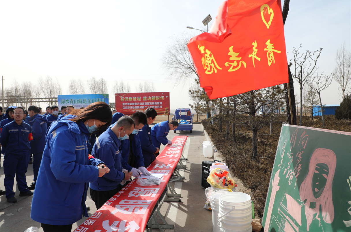 當天下午,天朗氣清,春風送暖。團員們列隊集聚在廠區停車場前,共同唱響了屬于自己的團歌《光榮啊,中國共青團》,并紛紛在宣傳橫幅上簽下了自己的名字。接著,志愿護樹行動正式拉開了序幕。