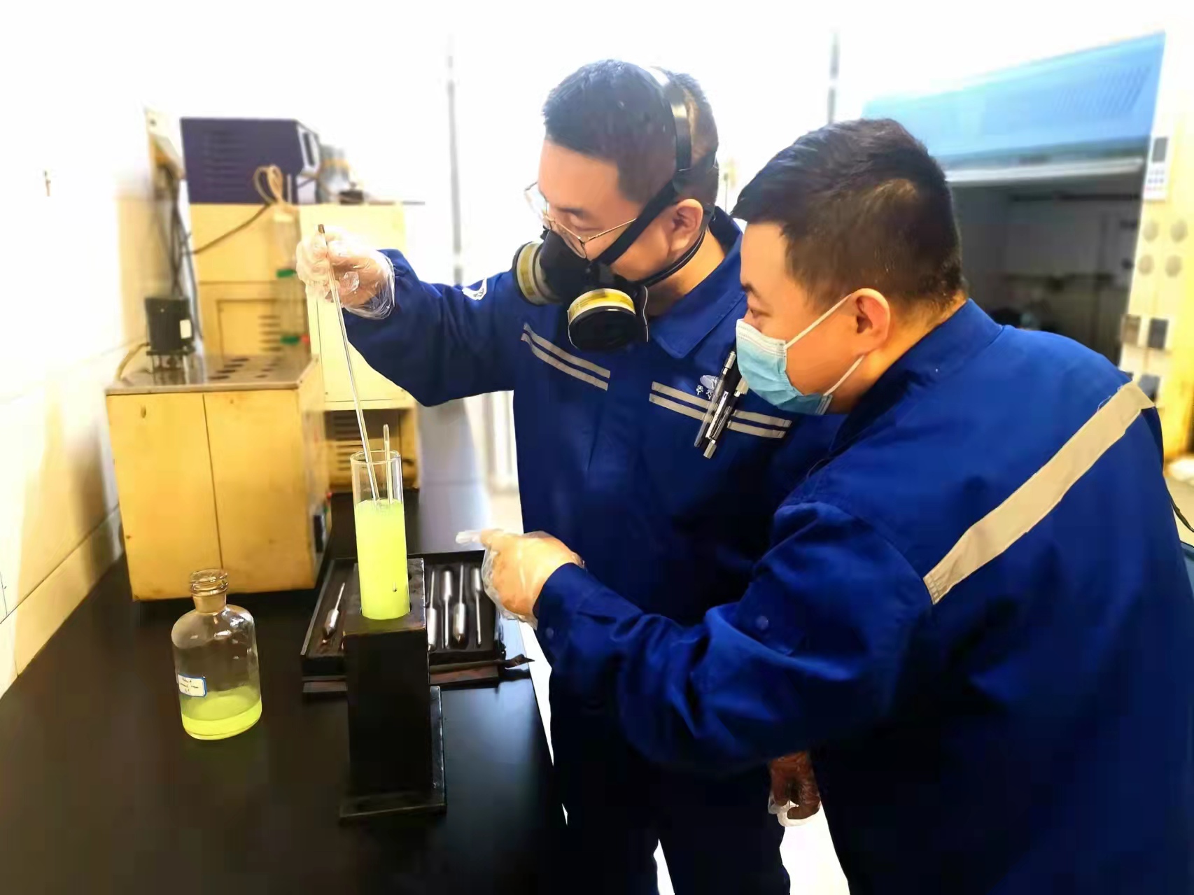 “手臂放平,以腕力帶動溫度計將油品攪勻。”“是這樣嗎?溫度計需要上下往復攪拌?”“對,眼睛要與溫度計刻線齊平。”“好的,師傅。”在質量監督部油品三實驗室,師傅景帥在教徒弟手動打密度。“確立了師徒關系,就意味著承諾和責任。雖然現在密度的測定已經用全自動密度計的,但是我依然會讓他從手動開始學起,夯實基礎、學懂吃透,才能更明白全自動儀器的原理。”景帥說道。