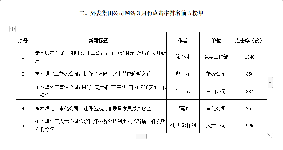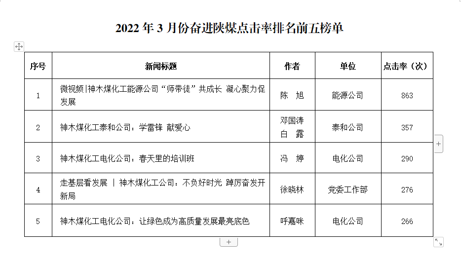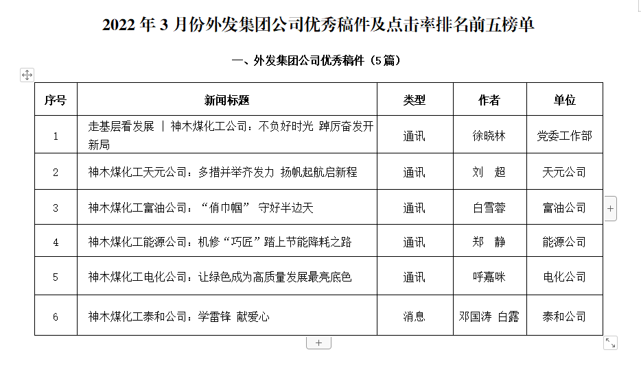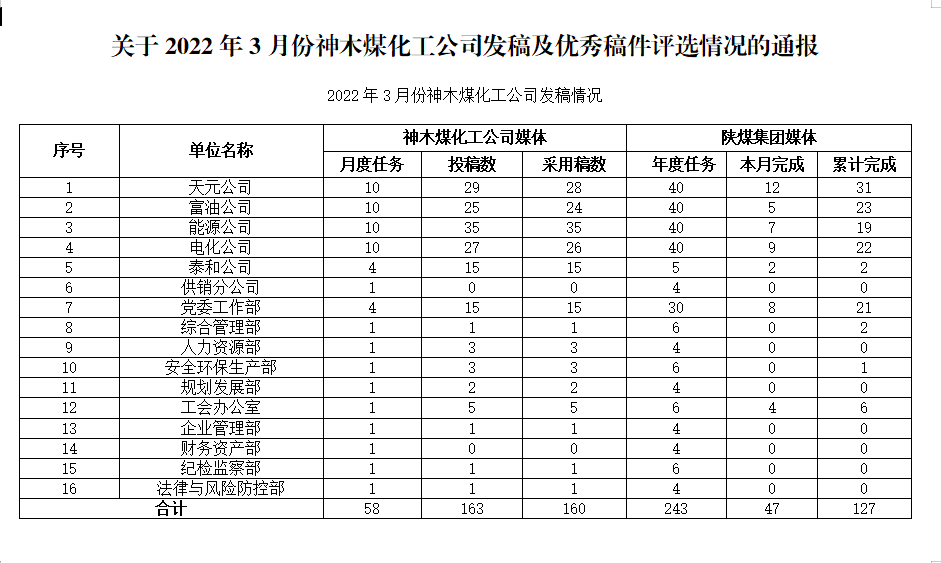 關(guān)于2022年3月份神木煤化工公司發(fā)稿及優(yōu)秀稿件評選情況的通報