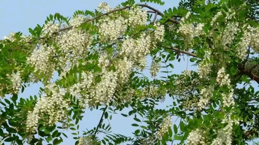 槐花,又名洋槐花,一般開在每年的4、5月間,花期為10至15天。每逢花期來臨,潔白的槐花綴滿樹枝,空氣中彌漫著淡淡的、素雅的清香沁人心脾。每到槐花季,就有蜂農匯聚而來,群群蜜蜂在槐樹林里嗡嗡飛舞,好像在演奏一曲晚春的樂章。它們辛勤采蜜,釀成的槐花蜜更是深受人們歡迎。村里的嬸嬸、嫂子們也經不住槐花香味的誘惑,提著竹籠,拿著長鉤去村北的槐樹坡上采槐花了。孩子們好像也聞到花香也湊熱鬧去了,那爽朗的笑聲傳遍山坡……采槐花也是有技巧的:樹皮黑褐色,樹型不高,樹冠不大的老樹,這樣的樹花多刺少,容易采摘,而且槐花比較香甜。采槐花的工具是一根長竿,一頭安裝上特制的鐵鉤,輕便好用,稍微一使勁,能把高處的槐花連枝一起擰斷,省去了爬樹被扎的麻煩,采摘效率大大提高。對于剛折下的洋槐花,最先撿到的都會的摘下一串捋下來朝嘴里塞,不僅聞著有沁人心脾的清香,吃著也有一種特有的香甜。在那個沒有多少零食可以吃的年月,這些都是孩子們的最愛。