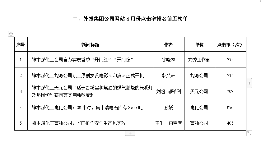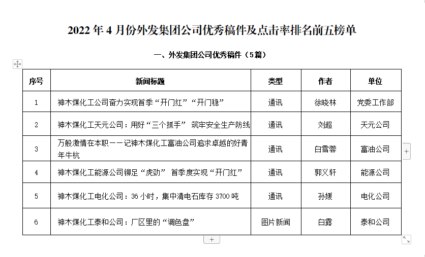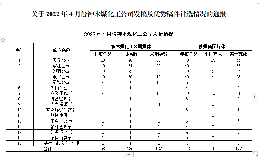 關于2022年4月份神木煤化工公司發(fā)稿及優(yōu)秀稿件評選情況的通報