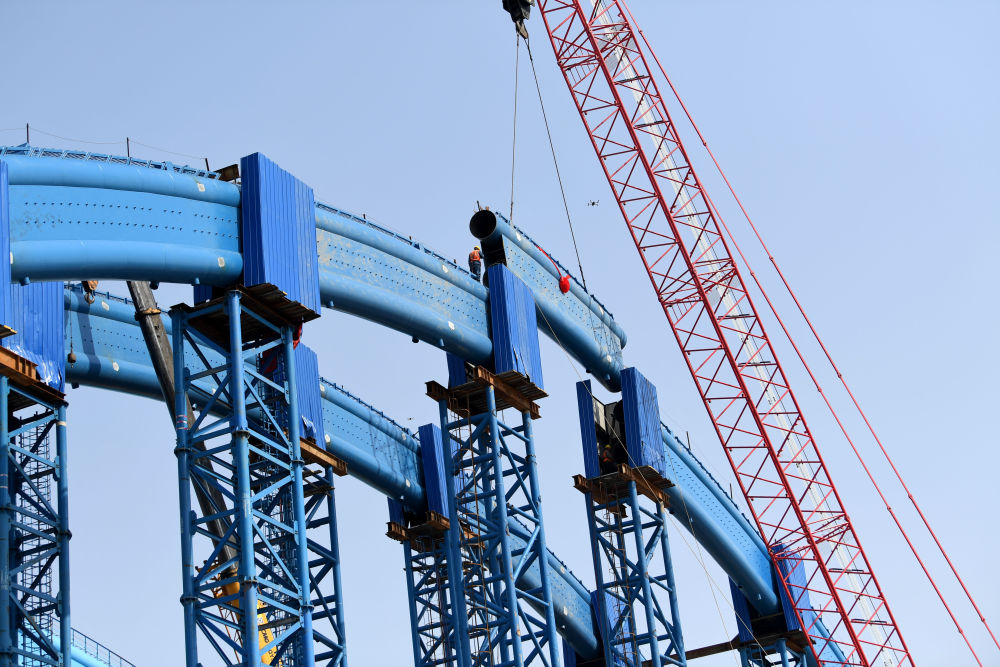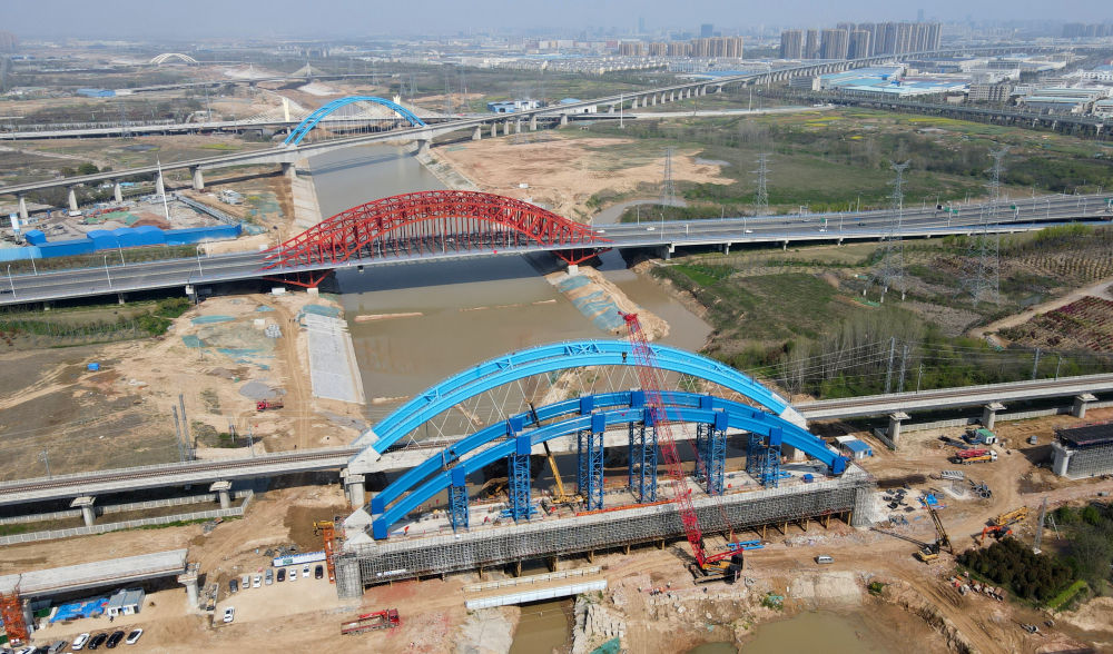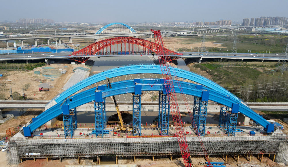 ↑這是中鐵四局引江濟(jì)淮合九鐵路改建工程特大橋系桿拱合龍施工現(xiàn)場(4月2日攝)。新華社記者 劉軍喜 攝影報道