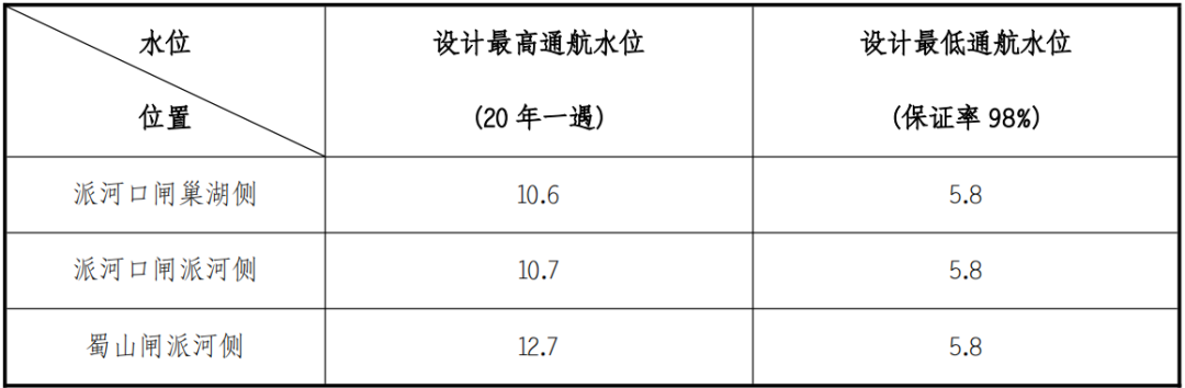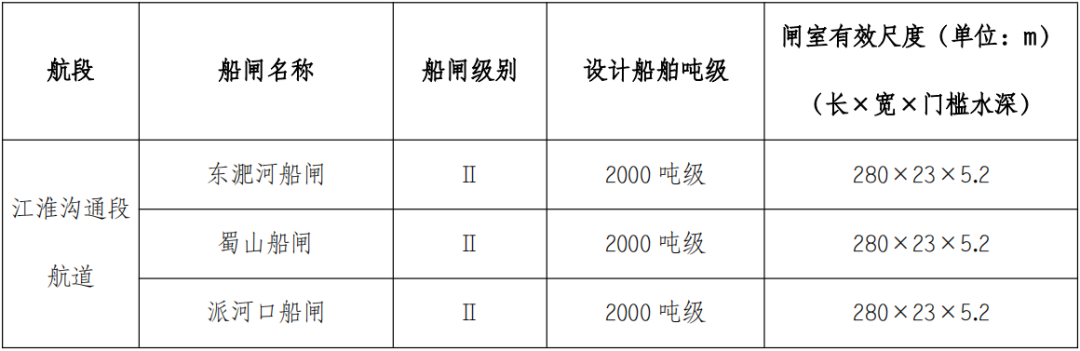 東淝河、蜀山、派河口船閘級別均為Ⅱ級,設計船舶噸級為2000噸級,閘室有效尺度280×23×5.2m(長×寬×門檻水深)。