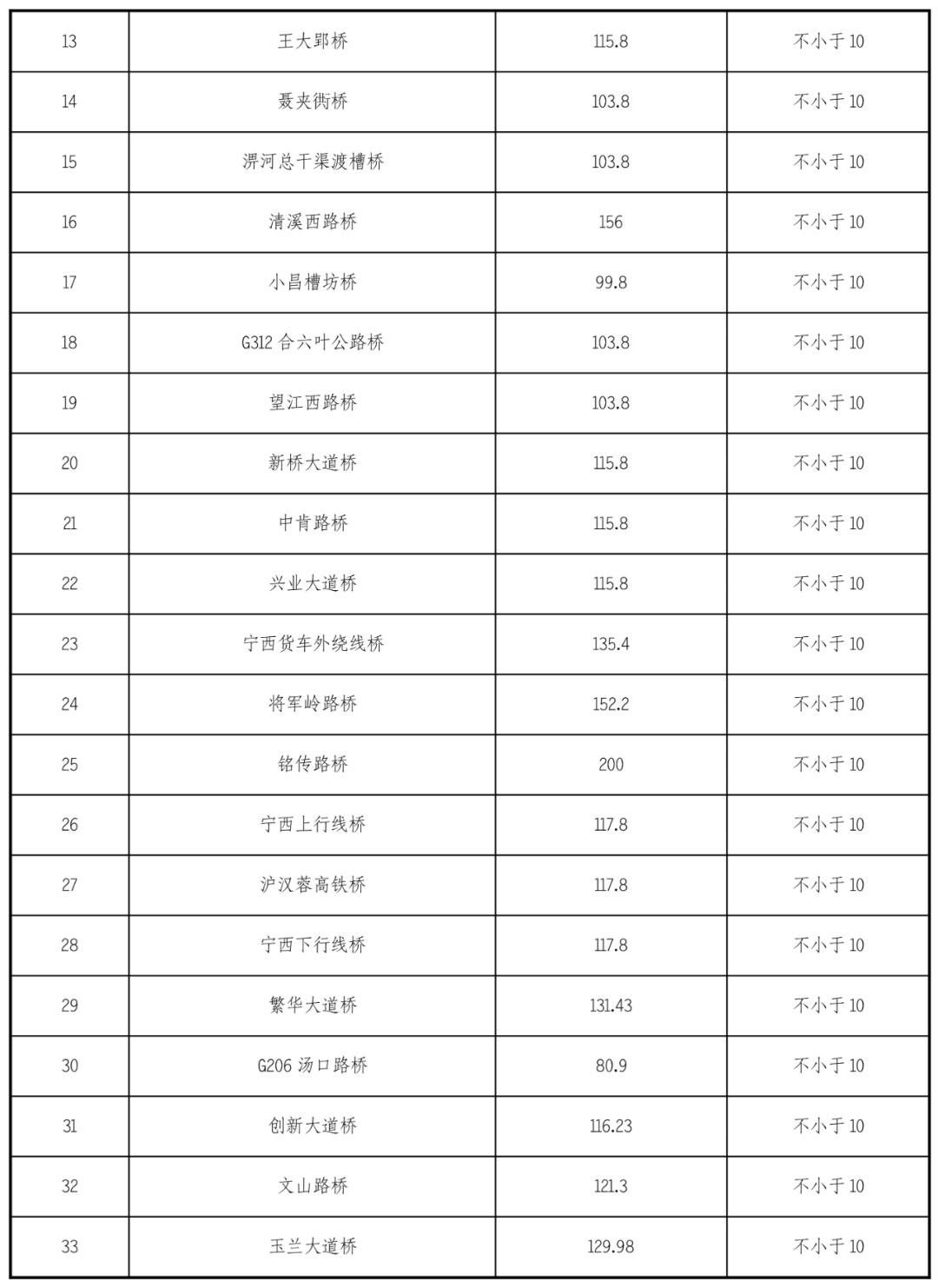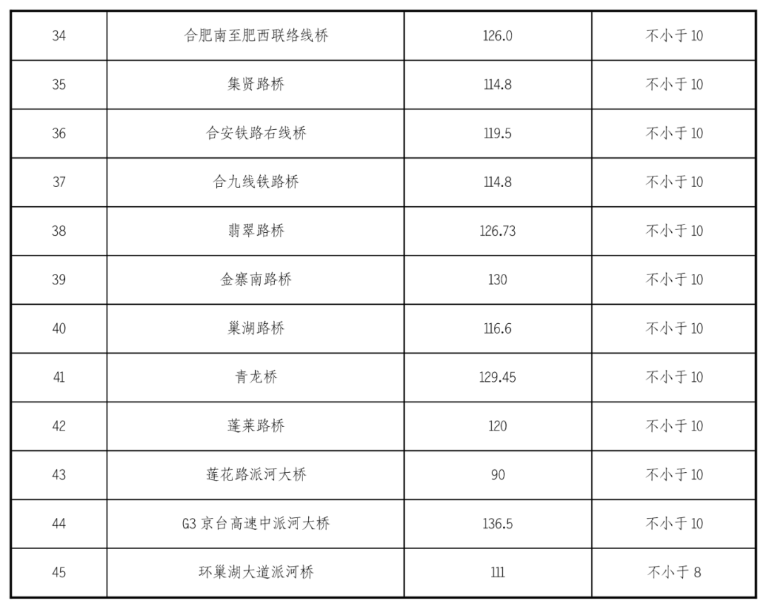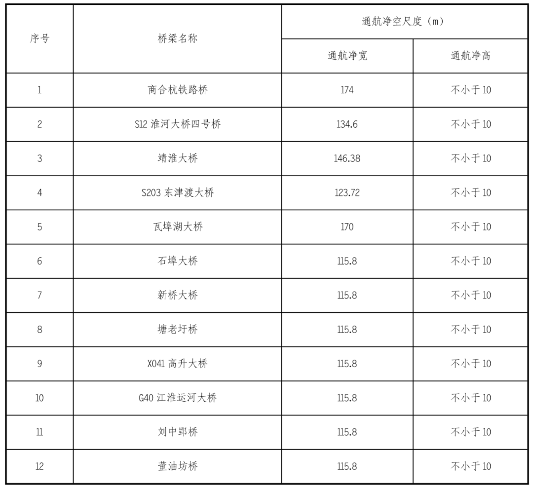 江淮溝通段航道沿線有現狀橋梁45座,橋梁通航凈空尺度參數見下表: